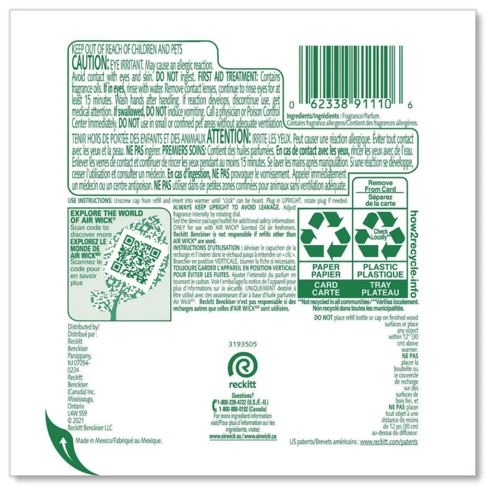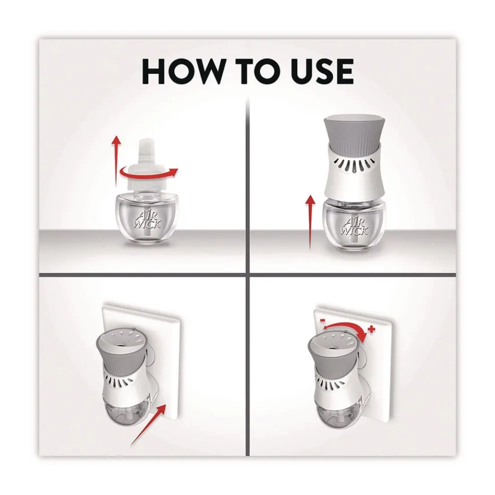 Leave a lasting impression on guests and ensure a consistent experience with Air Wick Scented Oil Refills with Essential Oils. Keep supply rooms stocked with the pleasant scents your guests come to associate with your business. Get up to 60 days per refill, on the lowest warmer setting, of natural-smelling fragrance with essential oil-infused formulas. Easily refill the Air Wick plug-in warmer by unscrewing the cap and inserting the refill until it clicks. Adjust the warmer settings to ensure the optimal fragrance for each room. Enhance entrances, common areas, offices, breakrooms and guest rooms with pleasant scents.