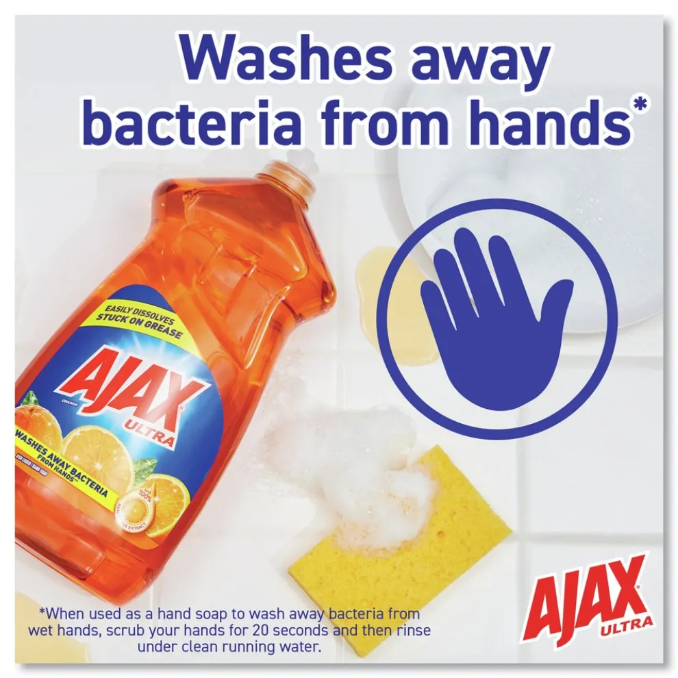 Ajax Ultra Triple Action Dish Liquid provides a pleasant and powerful cleaning experience while leaving your dishes sparkling clean. This product cuts grease to get dishes clean and spotless. This product also washes away bacteria on hands (when used as a hand soap, to wash away dirt and bacteria from hands, wash them for 20 seconds under clean running water) and fights odor on dishes. This dishwashing liquid is Kosher and phosphate-free.