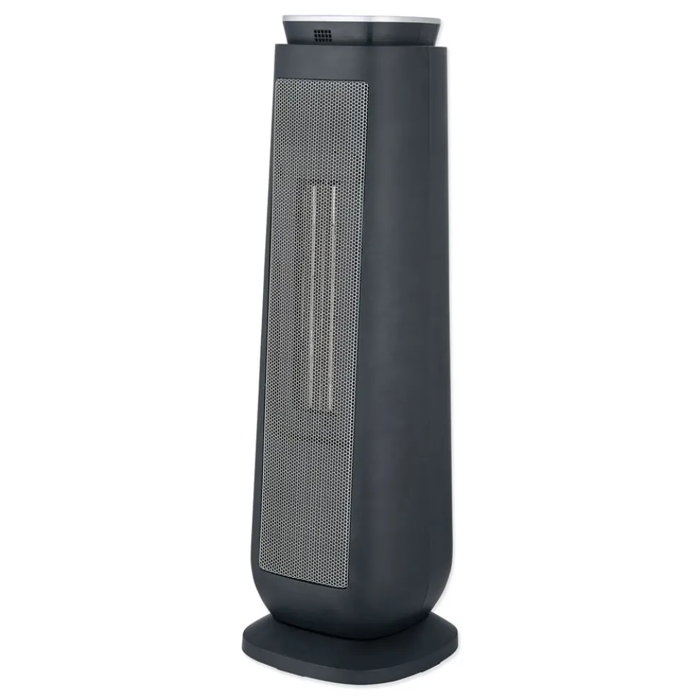 Oscillating tower heater is perfect to heat up your room or office. Air is warmed as it passes over a large ceramic and aluminum heating element providing more consistent and natural heat. Heat is dispersed by a powerful fan. Programmable digital thermostat can be set to your ideal temperature. Up to 1500 W heating output at maximum performance. Auto-off timer up to 8 hours. Designed with safety in mind with overheat auto shut-off protection, tip-over switch, and cool-to-the-touch plastic housing. Includes remote control. Intergrated carry handle.