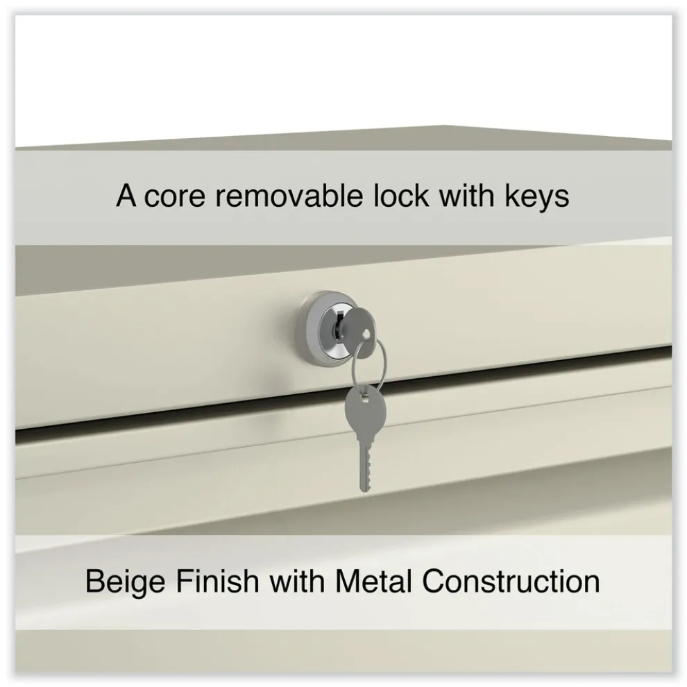 Drawers with side-to-side hang rails to accommodate letter/legal hanging files. Full drawer extension on steel ball bearing telescoping slide suspension helps drawers glide with ease. Stylish, full-width radius edge recessed pulls help to quickly open and close drawers. Anti-tipping interlock system allows only one drawer to open at a time. Single key core removable lock with 2 keys. 4 adjustable leveling glides. Durable powder coated finish helps prevent scratches.