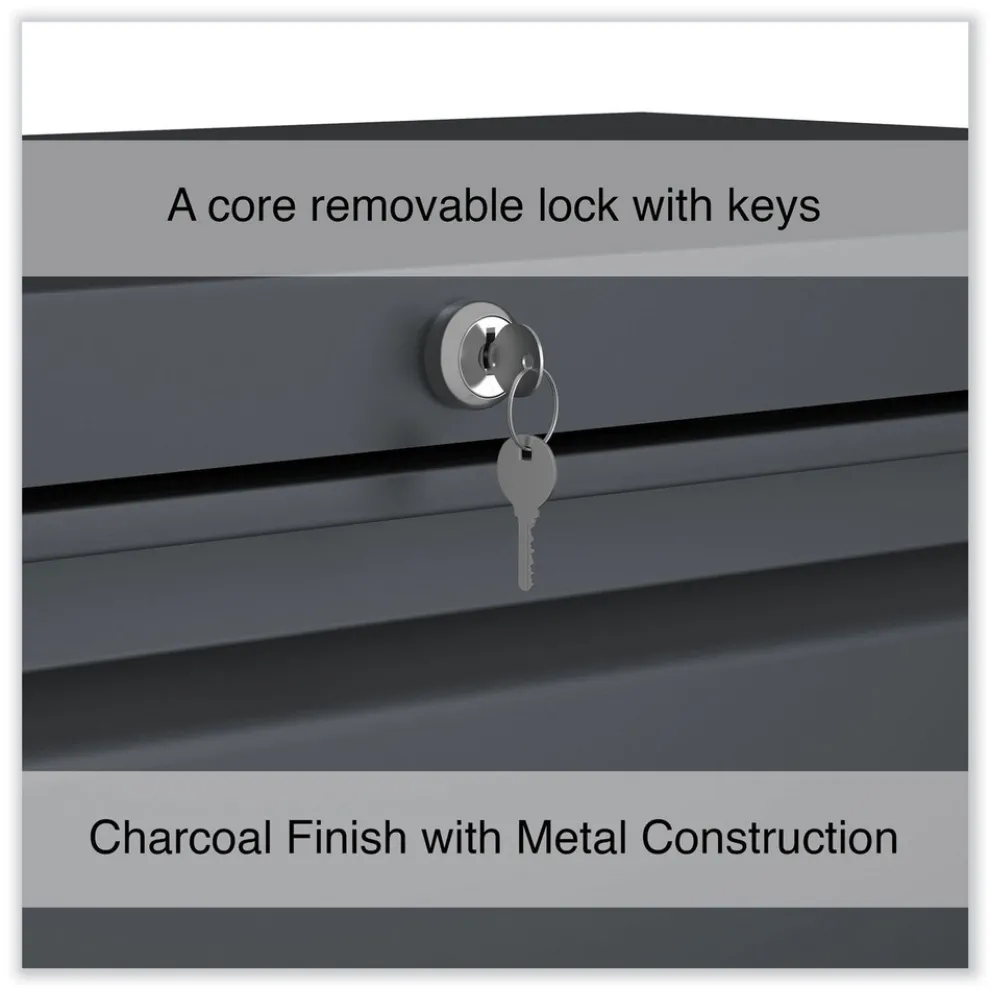 Drawers with side-to-side hang rails to accommodate letter/legal hanging files. Full drawer extension on steel ball bearing telescoping slide suspension helps drawers glide with ease. Stylish, full-width radius edge recessed pulls help to quickly open and close drawers. Anti-tipping interlock system allows only one drawer to open at a time. Single key core removable lock with two keys. Four adjustable leveling glides. Durable powder coated finish helps prevent scratches.