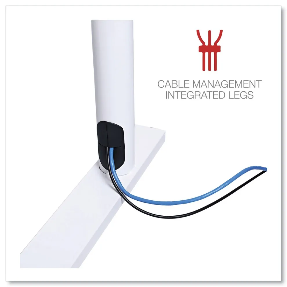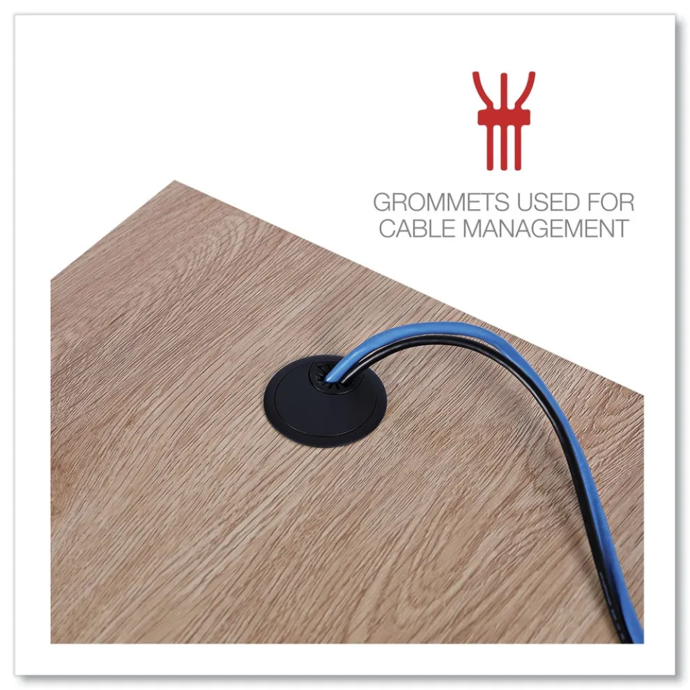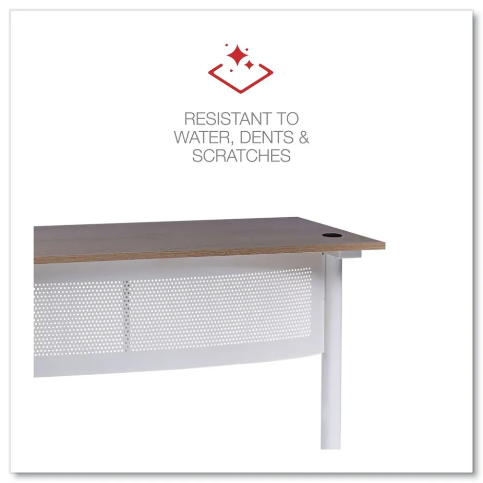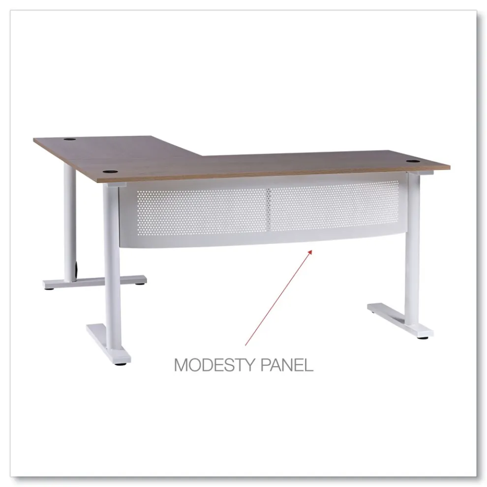 Delivering the best of both worlds, this Workspace by Alera L-shaped computer desk is both spacious and compact. The large desktop accommodates everything you need to be productive and has room to spare for displaying decorative items. The L shape is compact in footprint when placed in a corner but is finished on all sides so you can position it however you choose in a home office. Built-in cable management through legs allows for a cleaner look. Attached modesty panel for privacy if used in an office environment. The laminate wood desktop panel and metal base are sleek yet sturdy, giving this desk a modern simplicity that coordinates with most decors.
