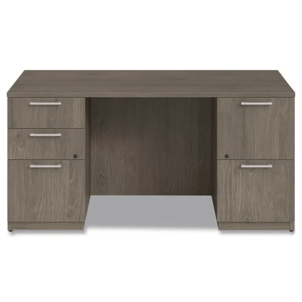 A thoughtfully designed piece that offers both functionality and style for any office environment. Equipped with two pedestals, this desk maximizes storage space to keep your workspace organized and clutter-free. These drawers offer versatile storage solutions for your office supplies, files, and personal items, allowing you to access what you need with ease. The double-pedestal design offers sturdy support, while the laser edge band construction enhances durability for long-lasting use. Crafted from particleboard, the desk is finished with a rich laminate and thermofused melamine (TFM), combining both strength and aesthetics. The premium laminate is resistant to burns and impacts, making this desk ideal for a high-traffic office setting. Its surface is designed to withstand the daily wear and tear of a busy work environment, ensuring that it maintains its sleek appearance over time. To enhance functionality, the desk includes two grommets for convenient cable management, allowing you to keep wires and cords organized and out of the way. Additionally, adjustable glides provide stability on uneven flooring, ensuring a level surface no matter where the desk is placed.