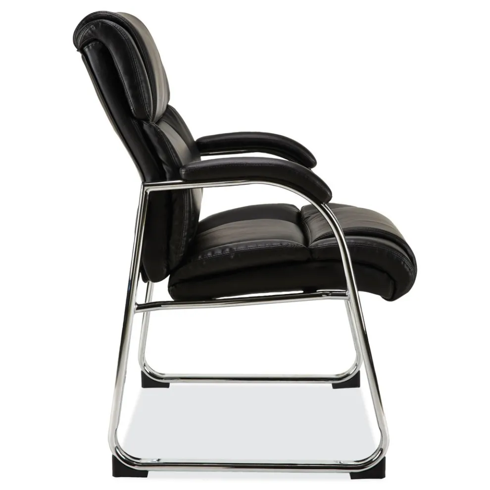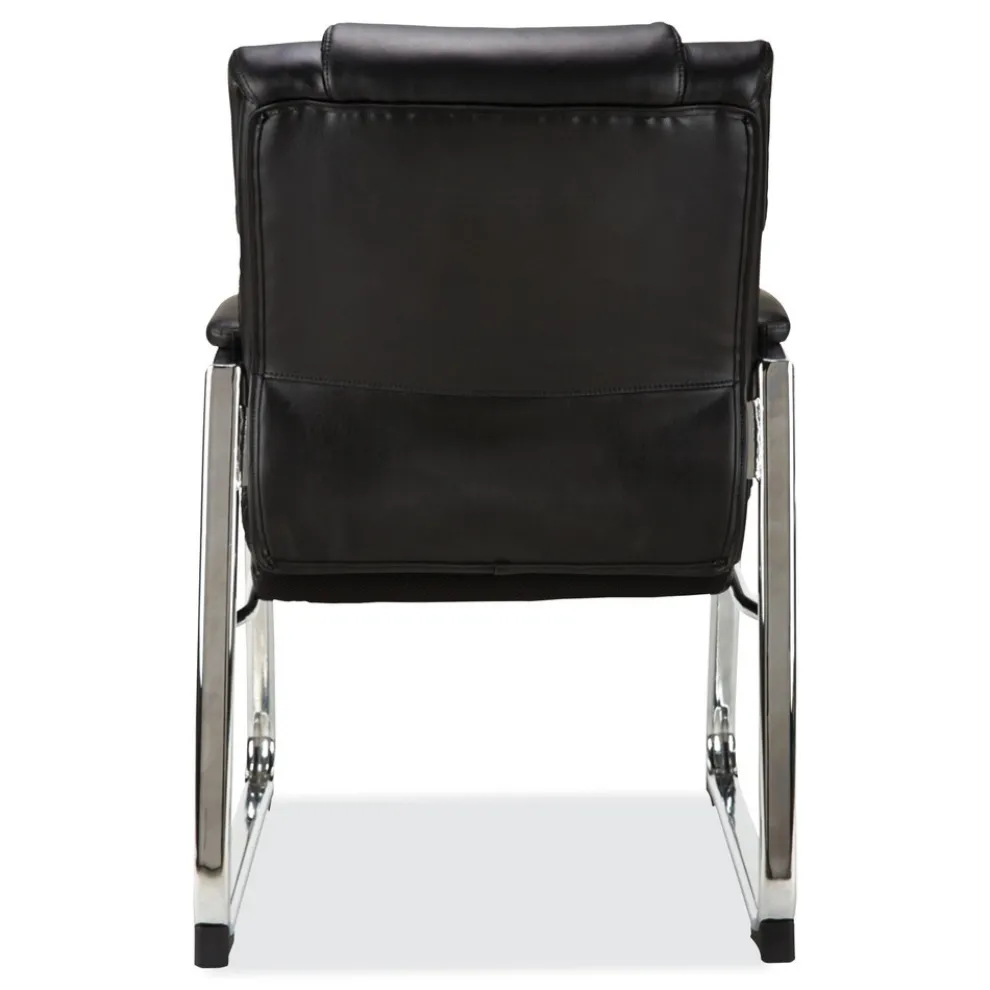 Welcome visitors to your lobby or office with a comfortable and stylish leather guest chair. Plush comfort with segmented seat and back padding. Curved, padded armrests offer upper body support. The bonded, durable leather upholstery wipes clean, making it ideal for lobbies or waiting areas. The sled-shaped base keeps the chair stable and integrated floor glides prevent scratches and scuffs. The polished chrome accents and sleek silhouette add an upscale, modern look to your office, reception area, or lobby.