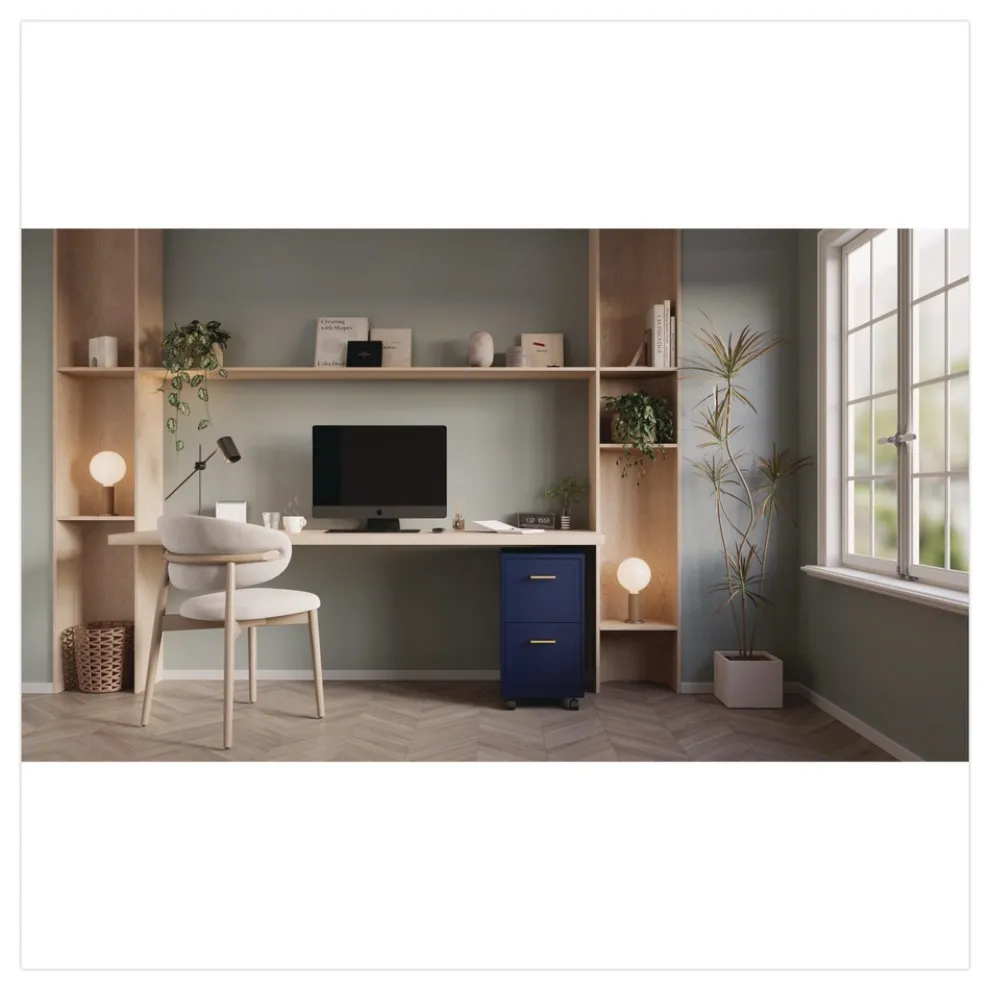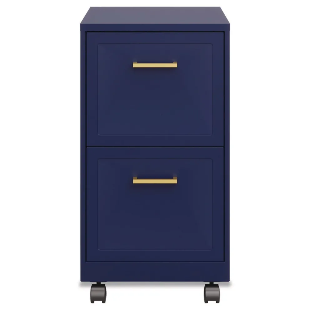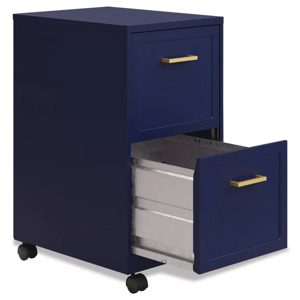 Vertical file drawers accommodate letter-size hanging file folders. Full high-side drawers provide storage solutions for other office essentials. Smooth patented glide suspension drawer slides. Matte nickel pulls and square embossed fronts elevate the cabinet for a more enhanced look. Three-quarter drawer extension. Fully assembled welded cabinet. Assembly of the handles and optional casters required. Tucks under most work surfaces and office desks with easy-roll casters.