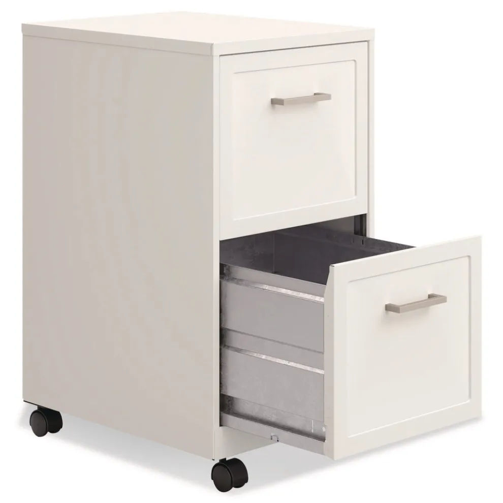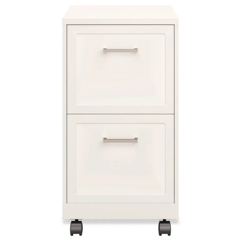 Vertical file drawers accommodate letter-size hanging file folders. Full high-side drawers provide storage solutions for other office essentials. Smooth patented glide suspension drawer slides. Matte nickel pulls and square embossed fronts elevate the cabinet for a more enhanced look. Three-quarter drawer extension. Fully assembled welded cabinet. Assembly of the handles and optional casters required. Tucks under most work surfaces and office desks with easy-roll casters.