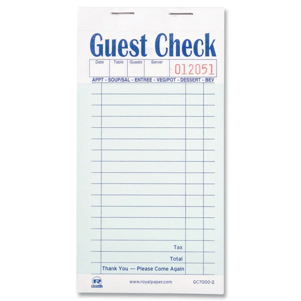 Combination order book/customer receipt pad helps keep wait staff organized and efficient. Menu prompts provide a convenient reminder to service professionals, making it easier to maximize each table’s order potential. Wider ruling delivers ample space for order itemization and notation.