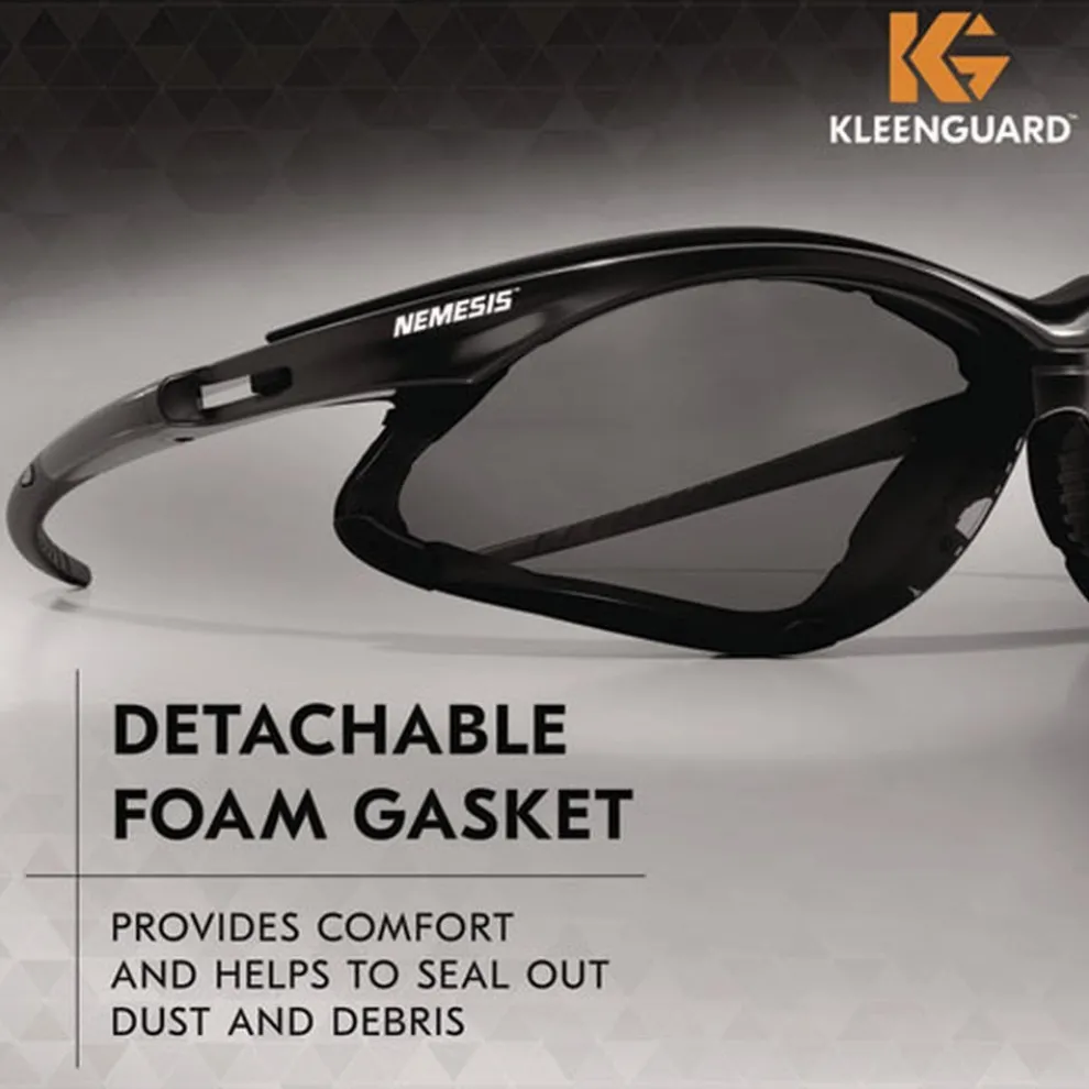 KleenGuard Personal Protective Equipment (PPE) enables rather than inhibits allowing for maximum productivity and safety for you and your employees. With KleenGuard Nemesis Foam Safety Glasses, you get sleek, modern eyewear with durable, lightweight construction. That is just one of the reasons why millions of people wear them for protection both at work and at home. KleenGuard Nemesis Foam Safety Glasses have polycarbonate lenses that provide 99.9% UVA/ UVB/UVC protection to help prevent eye damage like cataracts, retinal damage, and other conditions that can cause temporary vision loss. The wraparound frame has a base curve of 8 that extends the range of peripheral protection, as well as soft touch temples for comfort. KleenGuard Nemesis Foam Safety Glasses have a patented nose piece designed to be extremely flexible, to channel sweat away from the eyes, and to help prevent slippage down the nose all for long-term comfort. Each pair of KleenGuard Nemesis Foam Safety Glasses come with a neck cord for securing them, so that the glasses are ready to protect at a moment’s notice. In addition, each pair features a detachable and re-attachable foam gasket that provides comfort and helps to seal out dust and debris. The safety eyewear is manufactured to comply with the ANSI/ISEA Z87.1+ standard for personal eye protection. Both men and women will find these stylish glasses to be comfortable and functional for construction, manufacturing, gun shooting/shooting range, and a host of other industries. In addition, these safety glasses are recyclable through The RightCycle Program by Kimberly-Clark Professional, the first manufacturer-led PPE recycling program. Remember: comfort and style drive compliance, so it pays to provide comfortable designer glasses that your staff will be proud to wear. Making the right Personal Protection choice is difficult. Perform with distinction with KleenGuard Personal Protective Equipment (PPE).