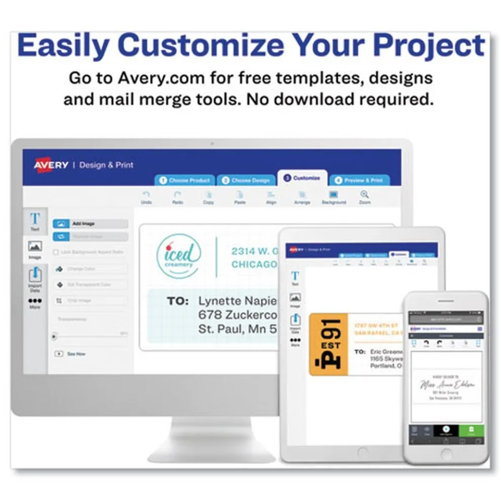 Easy Peel White Address Labels are great when you want to create professional labels quickly and easily. They’re perfect for high-volume mailing projects, labeling bottles, Ball and Mason jars, food containers, bath and beauty products, product branding, event decorations, party favors and crafts. Our Sure Feed technology is designed for a reliable feed through your printer helping prevent misalignments and jams. The proprietary Easy Peel feature makes applying the labels a breeze. Just bend the label sheet to expose the Pop-up Edge, peel off your label and fold the sheet back to flat. To easily customize your labels, simply use the free templates and designs from Avery Design and Print. 8-1/2 in. x 11 in. sheets for laser or inkjet printers.