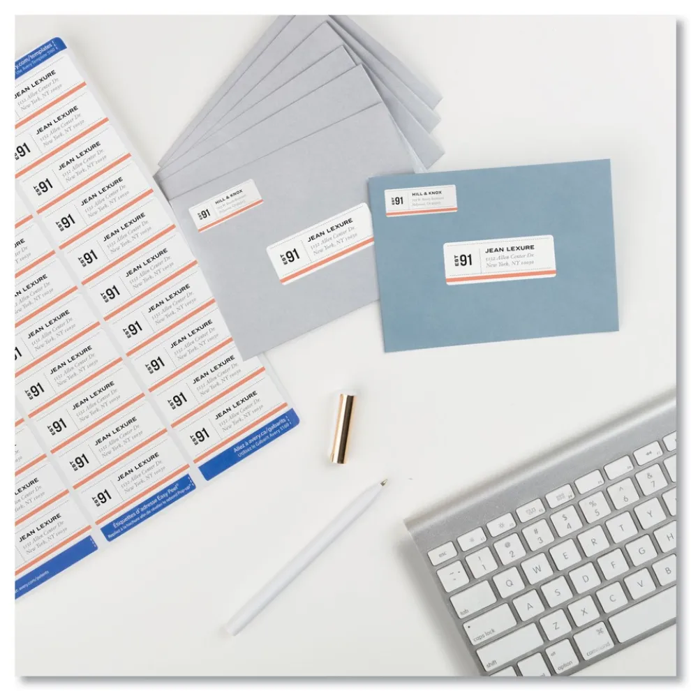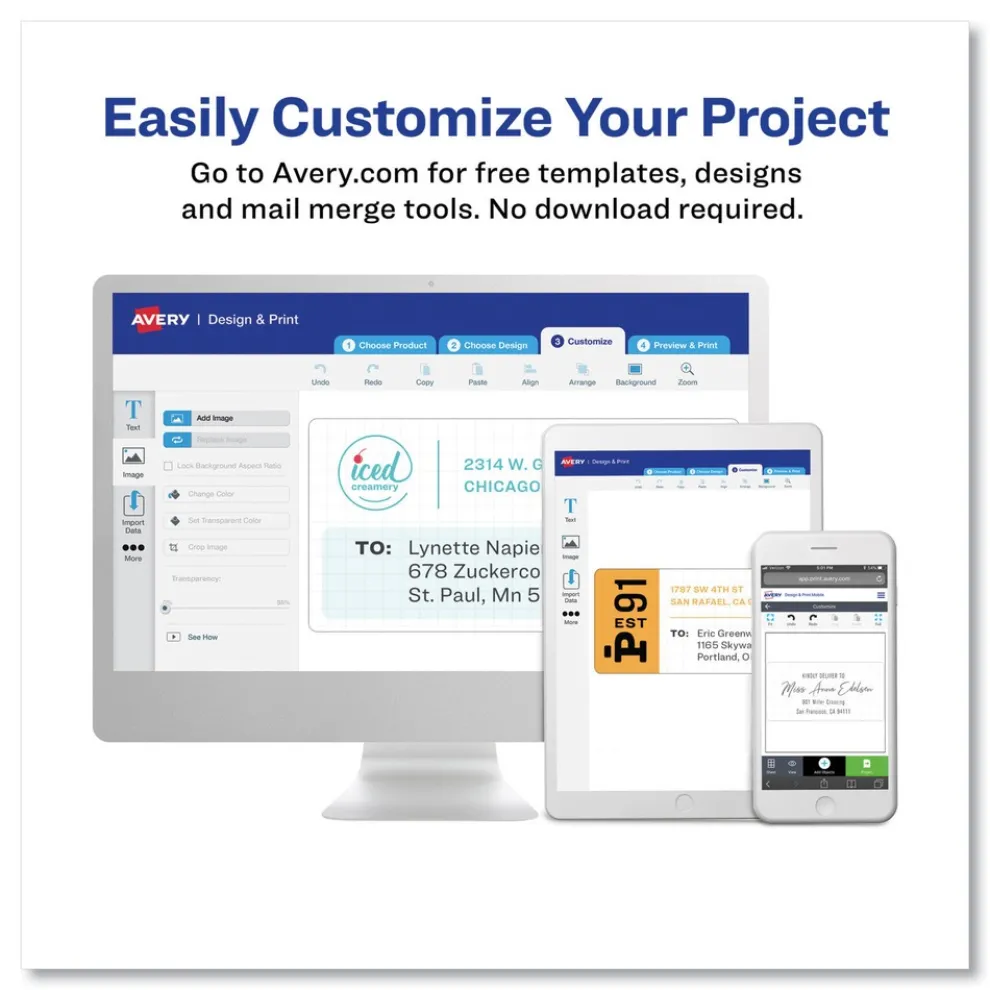 Easy Peel White Address Labels are great when you want to create professional labels quickly and easily. They’re perfect for high-volume mailing projects, labeling bottles, Ball and Mason jars, food containers, bath and beauty products, product branding, event decorations, party favors and crafts. Our Sure Feed technology is designed for a reliable feed through your printer helping prevent misalignments and jams. The proprietary Easy Peel feature makes applying the labels a breeze. Just bend the label sheet to expose the Pop-up Edge, peel off your label and fold the sheet back to flat. To easily customize your labels, simply use the free templates and designs from Avery Design and Print. 8-1/2 in. x 11 in. sheets for laser or inkjet printers.