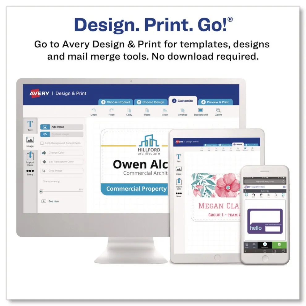 Ideal for either long-term or temporary name badges. Flexible, heavy-duty plastic fully protects printed name tag inserts (Avery 5392 – sold separately) or security access cards. Easy to Customize with free templates and designs using Avery Design and Print online.