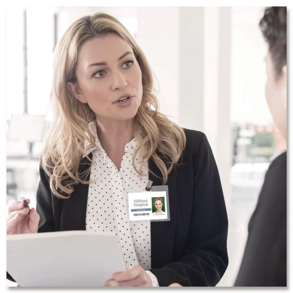 Fully protects printed name badge inserts (Avery 5392 – sold separately) or security access cards