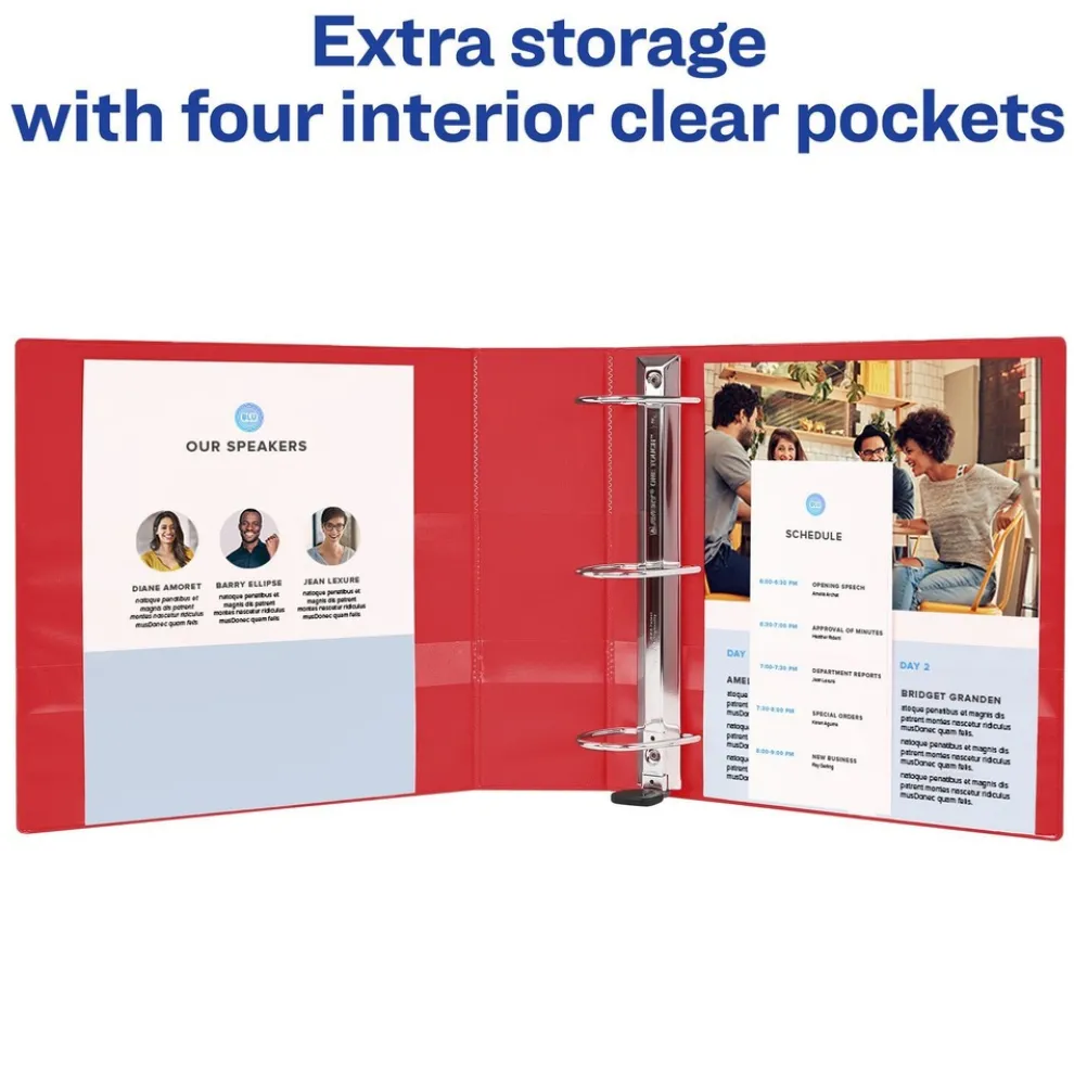 Heavy-Duty view binder with one touch EZD rings is perfect for long-term, regular use. Tear-resistant DuraHinge design is stronger and lasts longer. DuraEdge feature makes the sides and top more pliable, providing greater split resistance. Deep-textured film offers a smoother finish and features a linen pattern for a high-quality look and feel. Clear cover and spine for easy customization. Four clear, interior pockets provide extra storage space. Wider front and back panels fully cover standard dividers and sheet protectors. One touch EZD rings provide easy access and have a higher page capacity when compared to the same size round rings. Customize the cover with free, easy-to-use templates and designs at Avery Design and Print online.