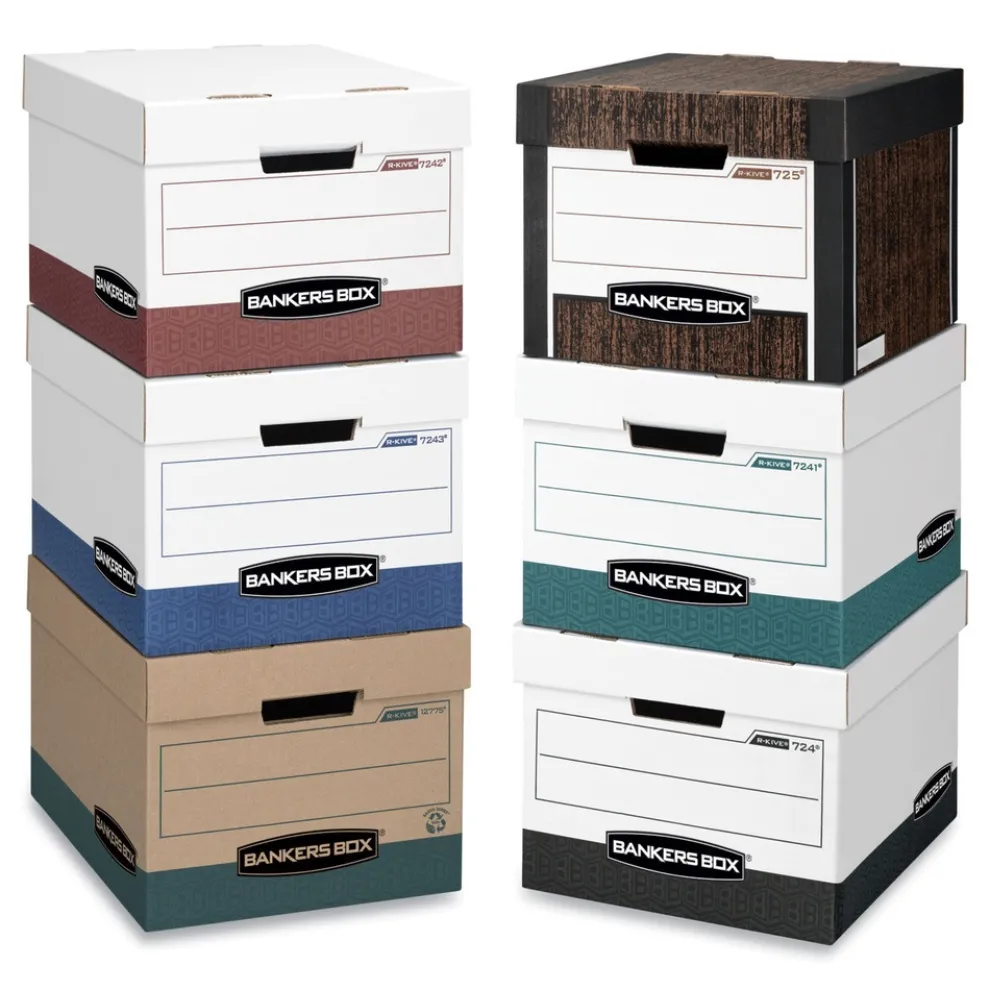 Bankers Box Recycled Stor/File Box has double-end, single-side construction. Medium-duty for use with or without shelving. FastFold quick and easy assembly. Deep, locking, lift-off lid stays in place for secure file storage. Perfect for storing important home or office papers and other items that you need to keep organized for future use. Made from recycled corrugated cardboard. Perfect for use in the office, home office, school, or wherever you need to store important papers, documents or important items.