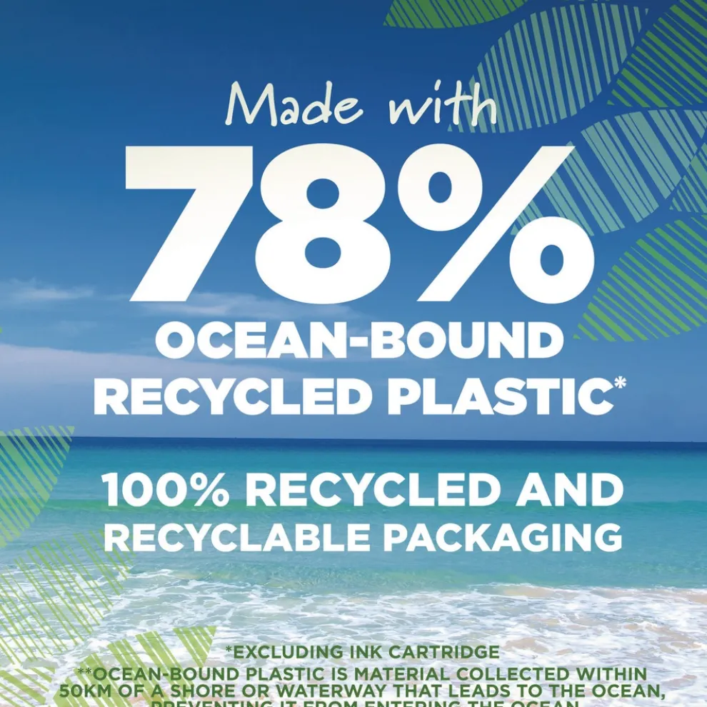 Barrel is made from 78% ocean-bound recycled plastic, while the paperboard packaging is made from 100% recycled content and is recyclable