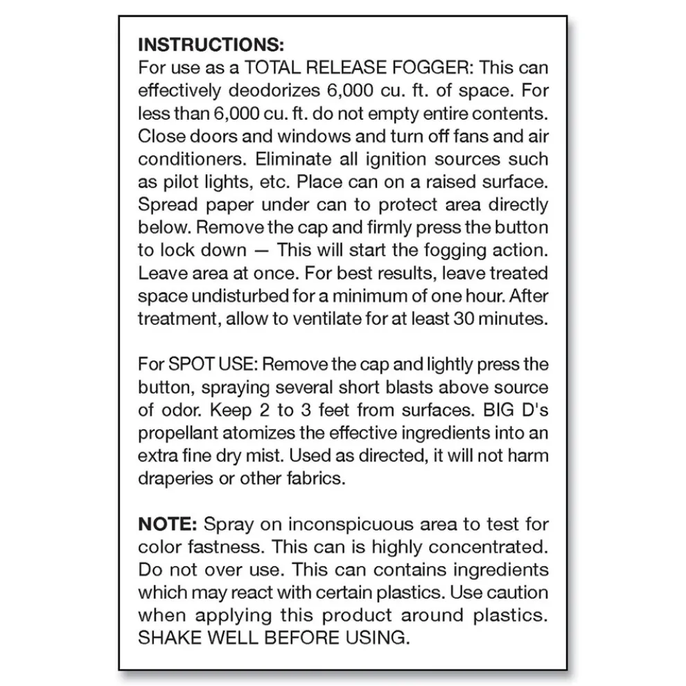 BIG D ODOR CONTROL FOGGERS destroy all odors in any home-size room, individual office or car that has been in a flood, a fire, a skunk encounter, or any other place that is enclosed or too small for a large electric fogging machine. ODOR CONTROL FOGGERS are far superior to handheld aerosols for the kinds of odors that force themselves into cracks and crevasses. They eliminate cigarette odors in cars and musty smells in closed rooms. They are excellent for use in property management and auto detailing. One 5 oz. can provides up to 6,000 cu. ft. of odor-destroying coverage.