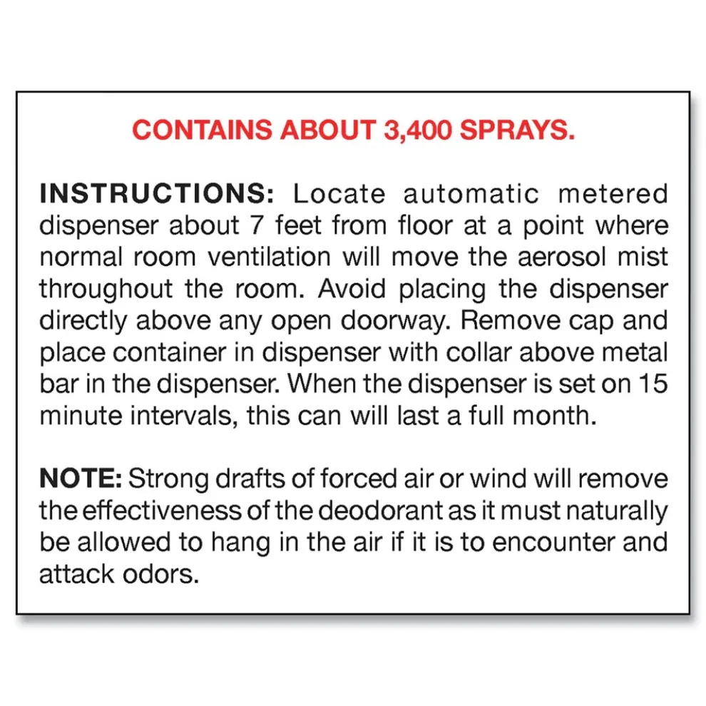Eliminate odors instead of just masking them, with a concentrated deodorant and odor neutralizer. A uniform actuator valve allows this can to be used in most metered aerosol dispensers. A long lasting fresh scent ensures a pleasant environment. CONCENTRATED ROOM DEODORANT for Metered Aerosol Dispensers is a true BIG D odor counteractant specially formulated for industrial and institutional needs. The formula contains no 1-1-1 Trichloroethane or fluorocarbons. BIG D offers an assortment of pleasant fragrances containing our special deodorizers that neutralize odors rather than mask them. The uniform actuator valve enables the aerosol canister to be used in BIG D METERED AEROSOL DISPENSERS. Each 7 oz. can contains approximately 3,400 sprays and effectively deodorizes a 6,000 cu. ft. area.