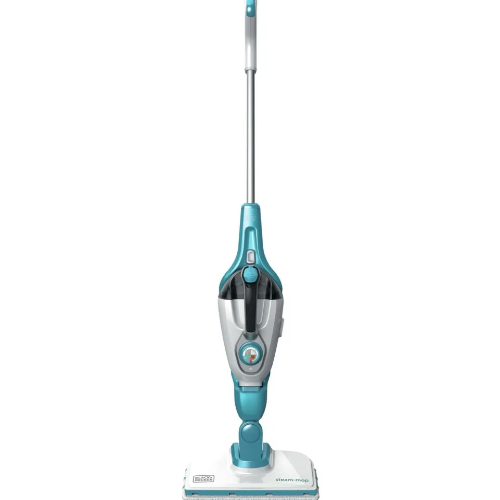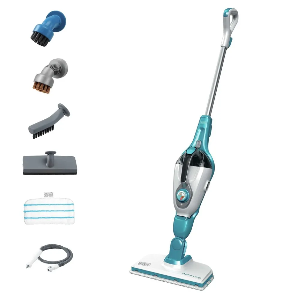 Harness the cleaning power of steam with the BLACK+DECKER 5-in-1 Steam Mop. Simply plug it in and it’ll be ready to go in just 20 seconds. The versatile design lets you use it as a mop or handheld steamer for maximum portability, even when going up and down the stairs. The swiveling mop head allows for effortless maneuverability around objects and access to cramped spaces. Clean a variety of surfaces in your home and remove stuck-on dirt and grime from sealed hardwood floors, grill grates, and glass shower doors, around faucets, within sealed grout lines, and more. The Steam Mop’s large-capacity water tank helps ensure you won’t run out before the job is done. Plus, it’s equipped with Smart Select variable steam control technology, so you can easily regulate steam for the task at hand. And the steam always flows continuously without needing to hold down the trigger. Multiple interchangeable attachments and accessories help you take on a variety of cleaning to-dos.