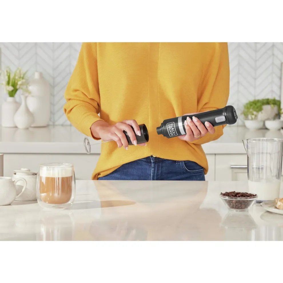 The cordless BLACK+DECKER kitchen wand milk frother attachment allows you to make creamy froth in seconds to elevate the morning coffee routine. Expand upon the traditional function of a milk frother and whisk protein powder, matcha, eggs, and more! Wand base, charging dock, and cord sold separately.