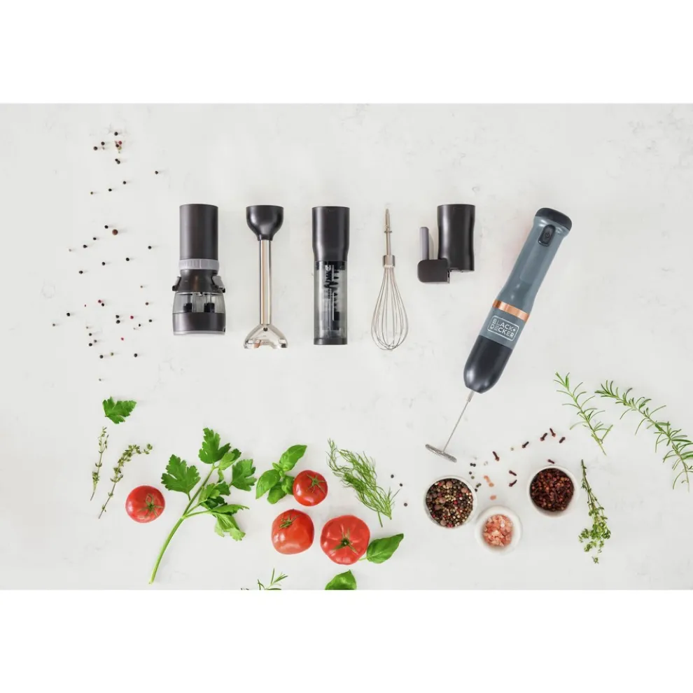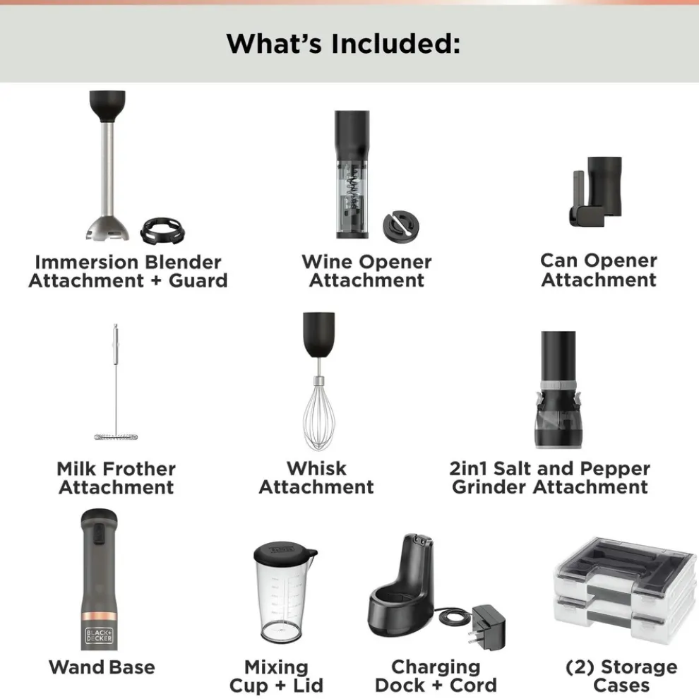 Multifunctional: the ultimate kitchen sidekick, the Black+Decker kitchen wand system is there to help you with a variety of cooking and food prep applications. Blend, whisk, froth, and more with the 6 included attachments.