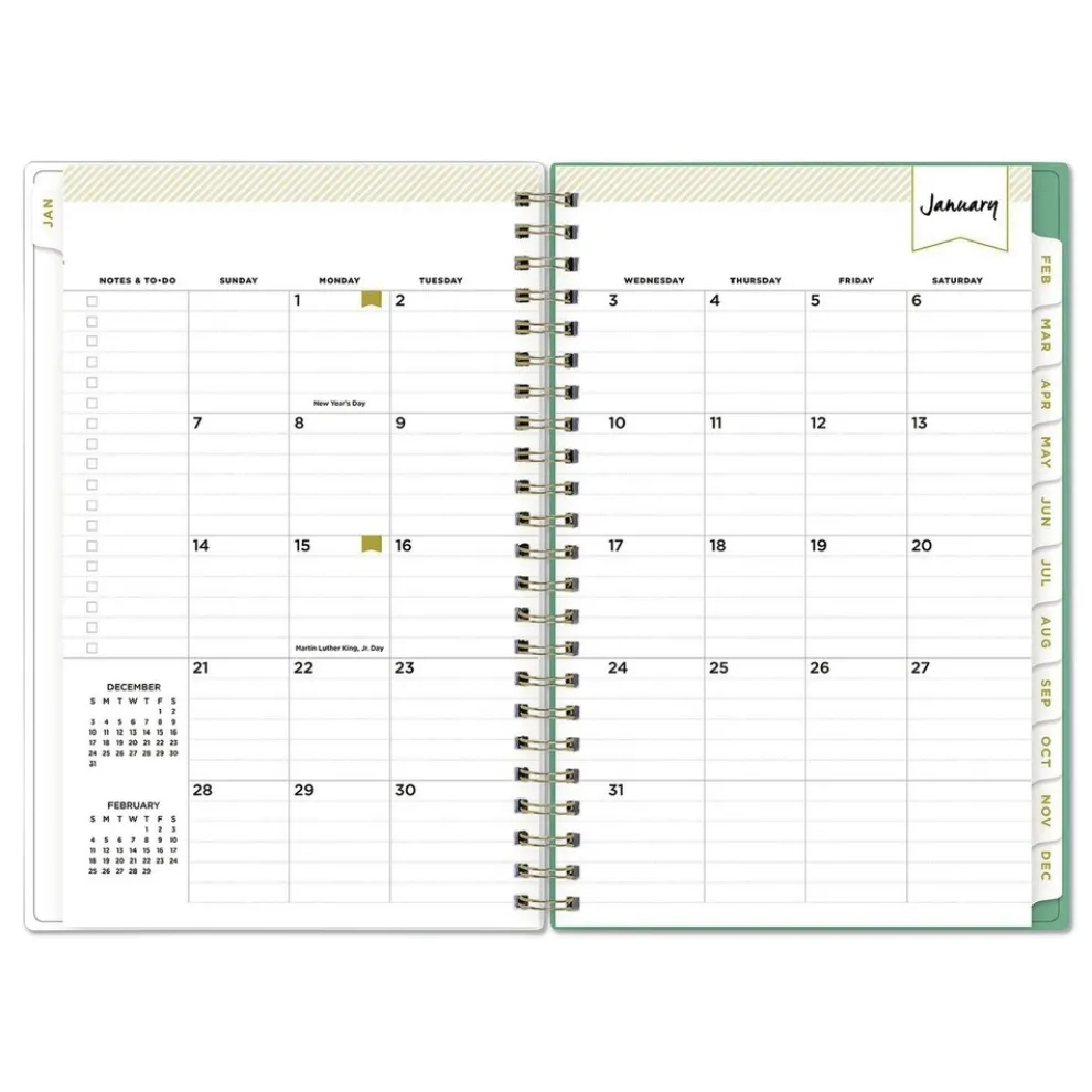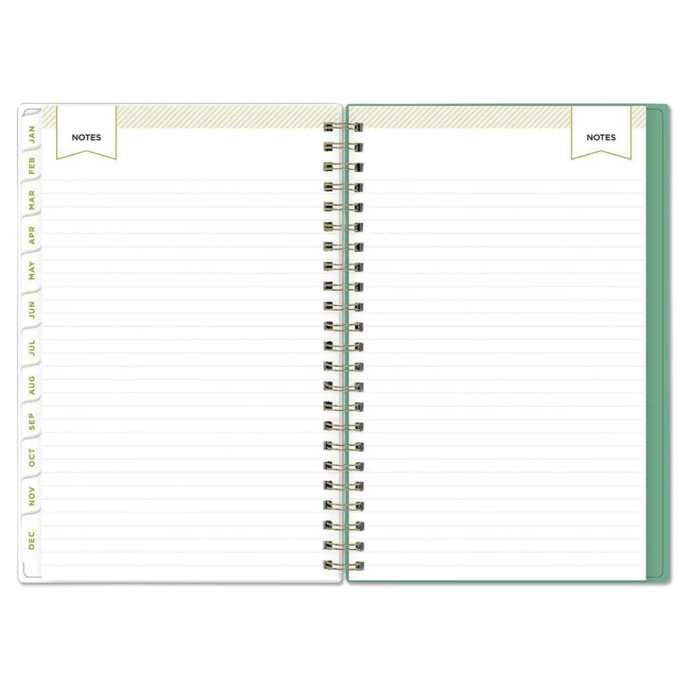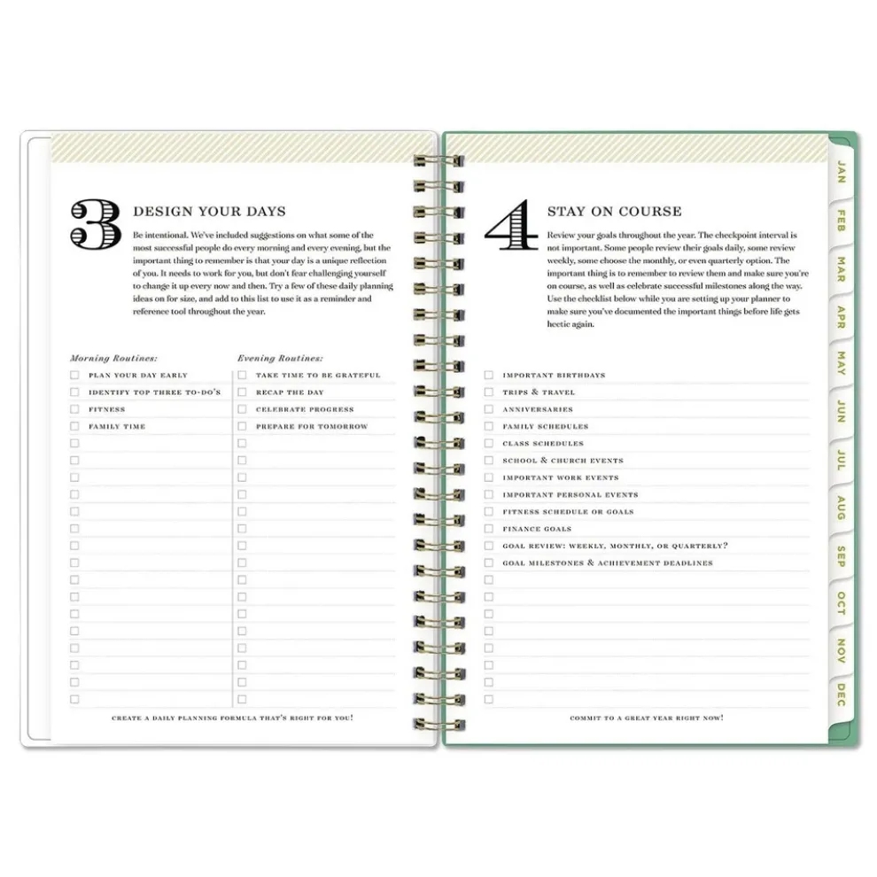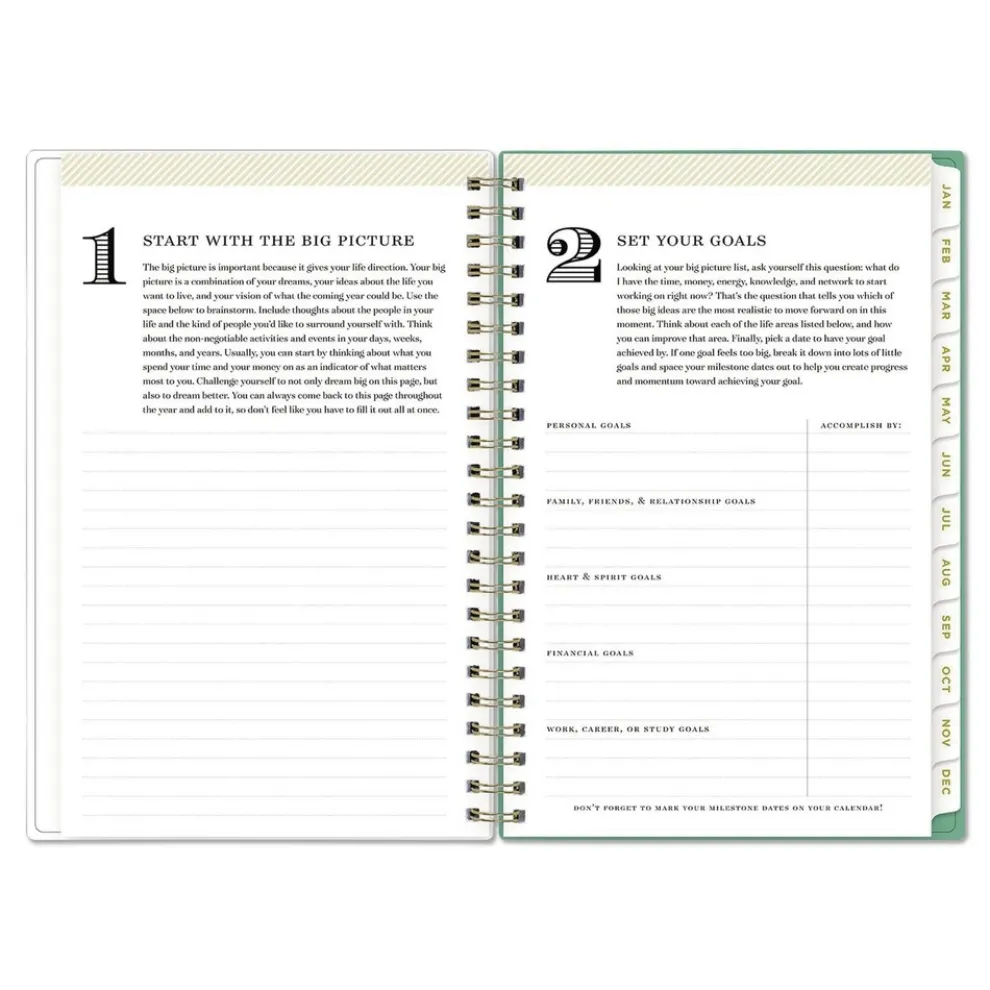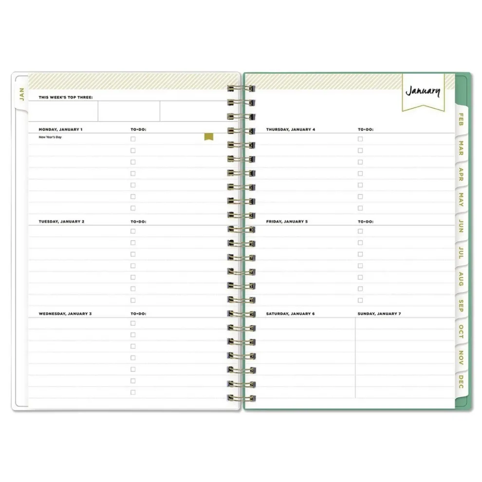 Weekly view per two-page spread contains space for daily schedule, to-do list, notes and gratitude sections, and an inspirational quote