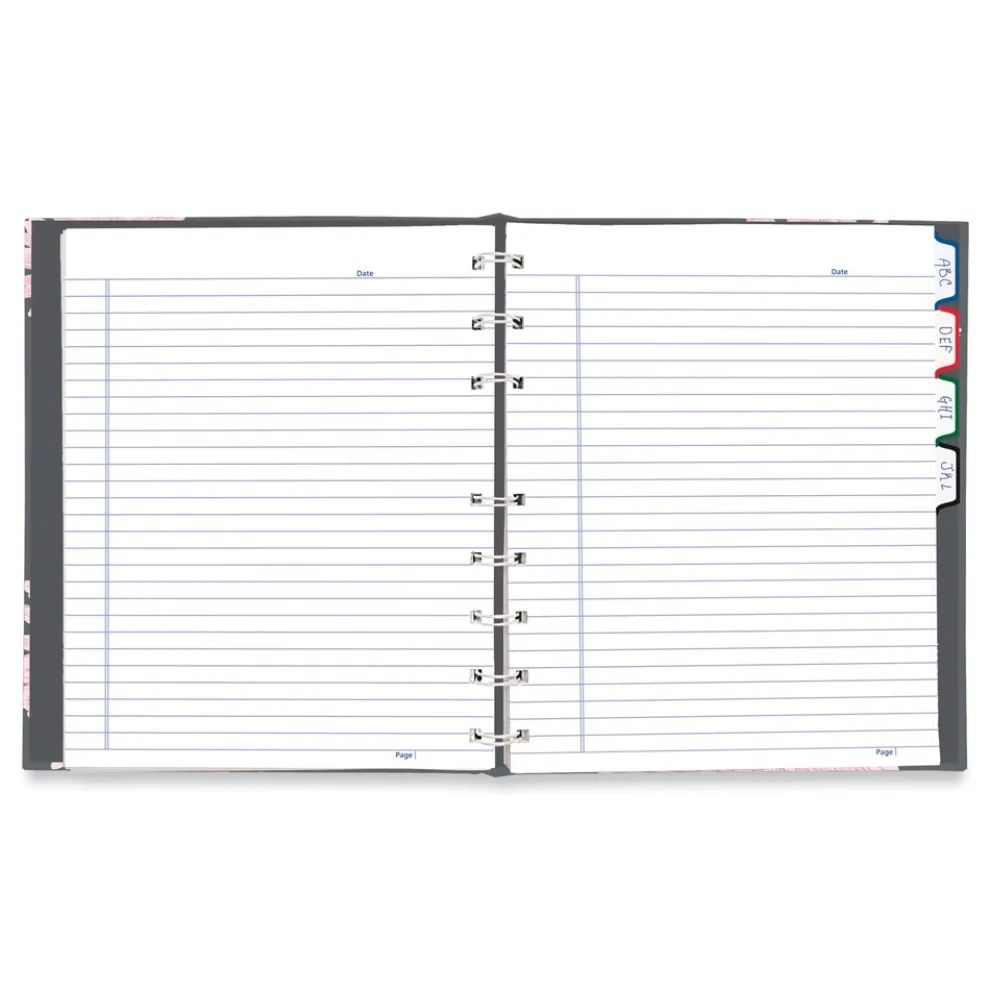 Take notes like a pro with NotePro. Hardcover notebook delivers increased writing stability while its lizard-look cover pattern adds an attractive element of professional sophistication. Each microperforated sheet features an abbreviated note-taking format with space for you to capture dates, titles and entry-specific page numbers. Variously colored self-stick tabs and labeling stickers are included for customizing an index, for adding a custom title to the front cover or spine as well as for drawing extra attention to important notes, pages and sections. Twin-wire binding allows the book to lie flat when open. Interior storage pocket accommodates loose sheets, receipts, tickets and more. Archival-quality paper is printed with vegetable-oil-based inks.