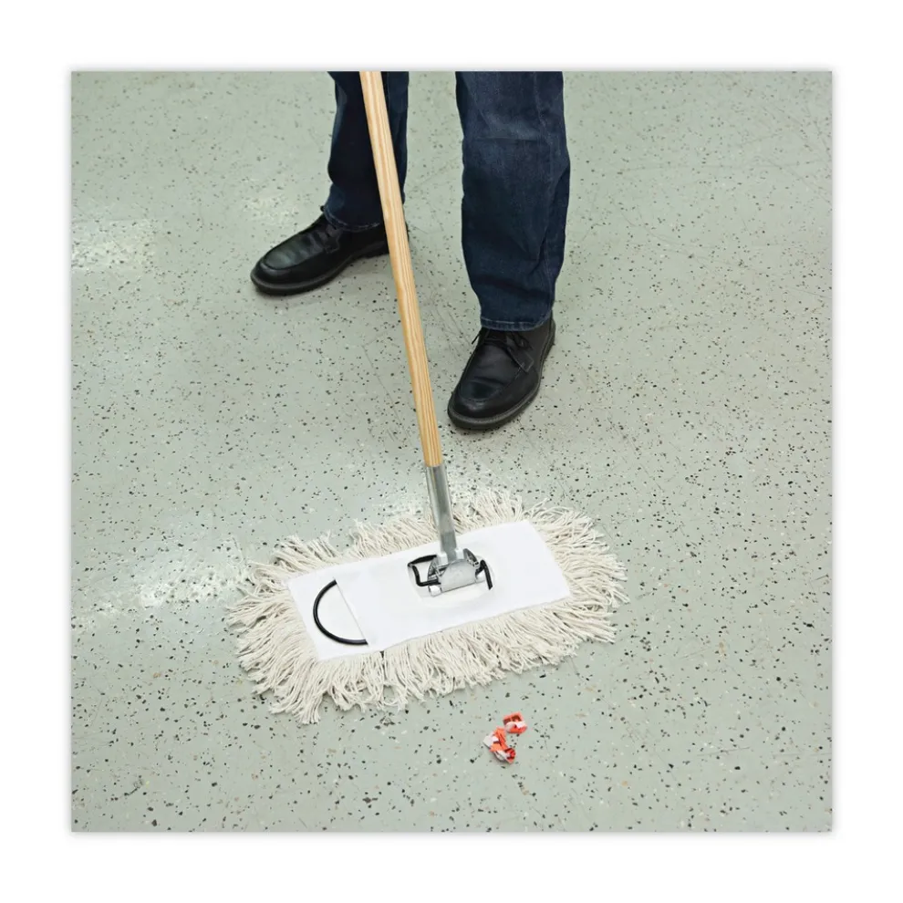 Ten-ply, Hygrade white cotton, cut-end design enhances durability while minimizing snags. Quick-drying, absorbent, slot pocket style with synthetic backing. Used for attaching a mop handle and dusting floors. Works with spray or liquid dust mop treatment and other solutions used to dust floors and add shine. Great for general purpose cleaning and wiping floor surfaces of various materials. Mop handle and dust mop frame are sold separately.