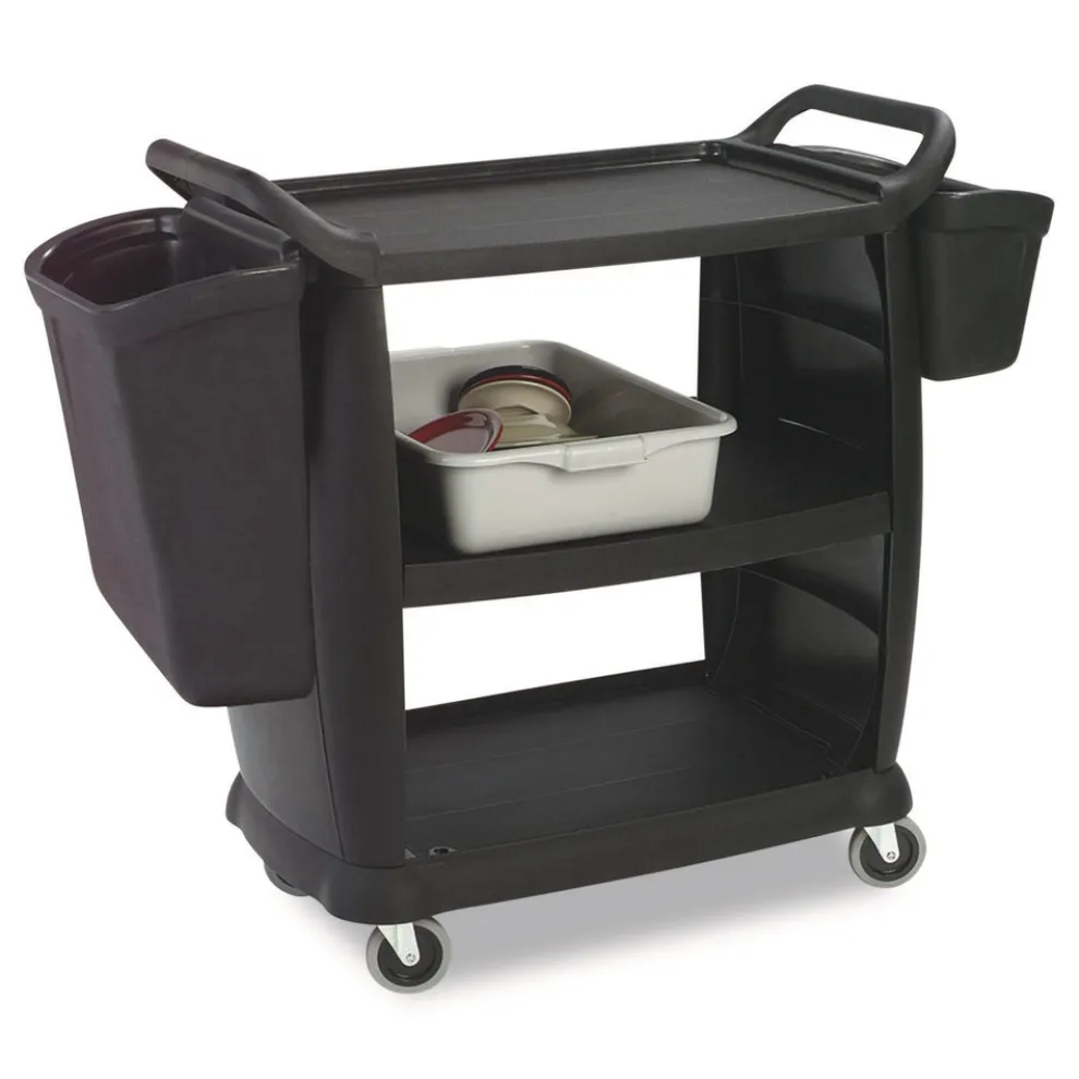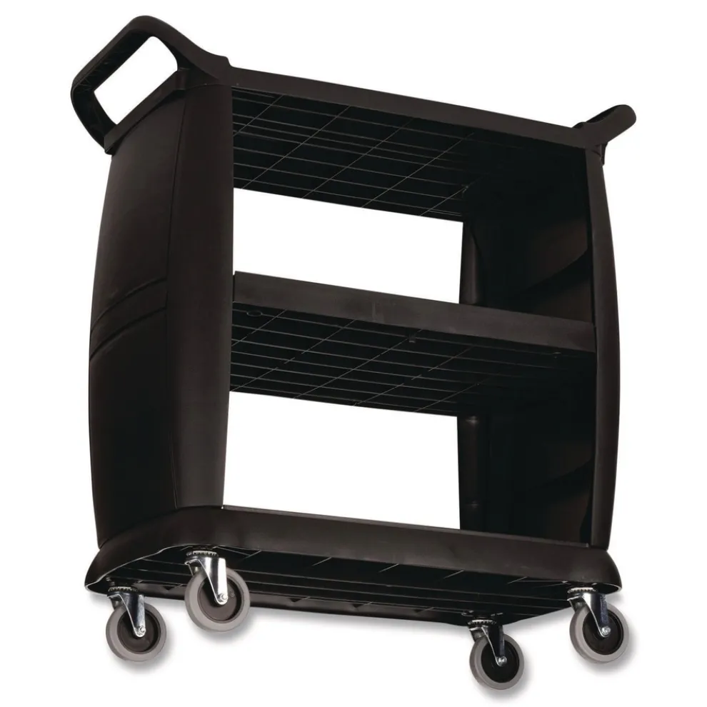 This Bussing Cart boasts a 300 lb capacity, making it fit for tough, heavy-duty jobs. It features multiple shelves that can each hold two side-by-side bus boxes to separate dishes and expedite cleaning. It also includes four omnidirectional casters that can maneuver over flat carpet, tile, linoleum and wood floors. The raised edges keep contents contained even when cart is in motion.