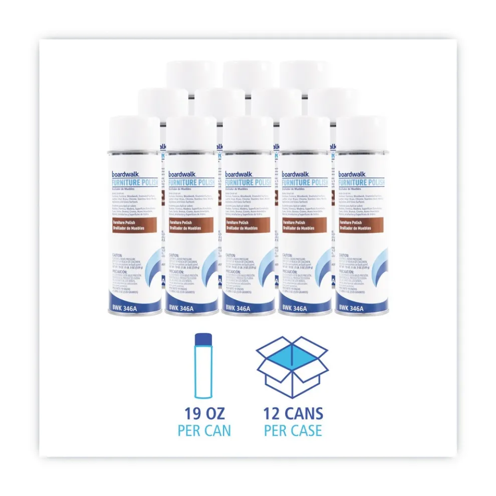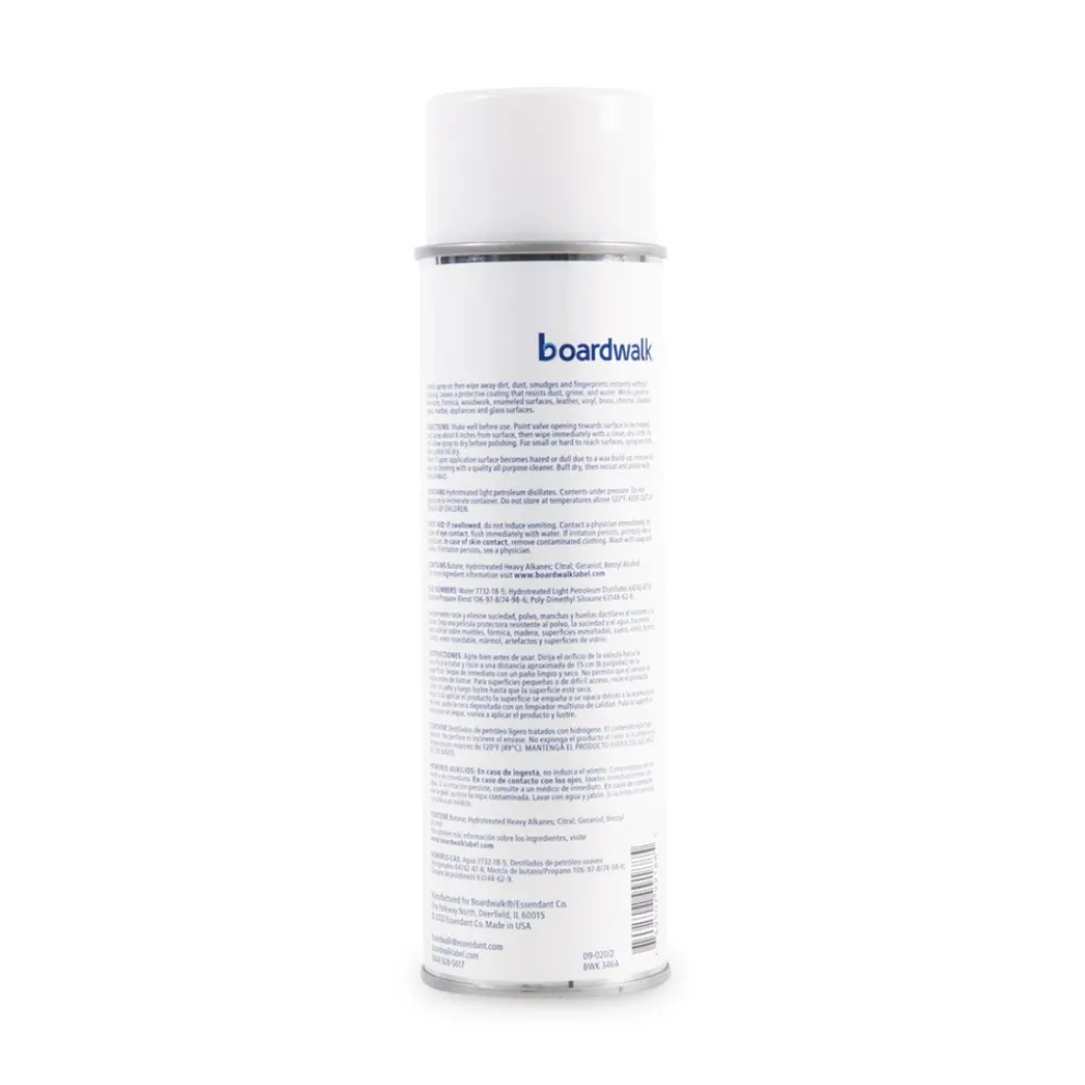 Eliminate dirt, dust, smudges, and fingerprints instantly without rubbing using Boardwalk furniture polish. Simply spray on and wipe clean for a lasting shine. Polish works great on furniture, Formica, chrome, stainless steel, woodwork, marble, leather, appliances, vinyl, glass surfaces, and brass. Enjoy clean surfaces longer with a protective coating that resists dust, grime, and water. Easy-to-use aerosol spray can is ideal for flat and vertical surfaces.