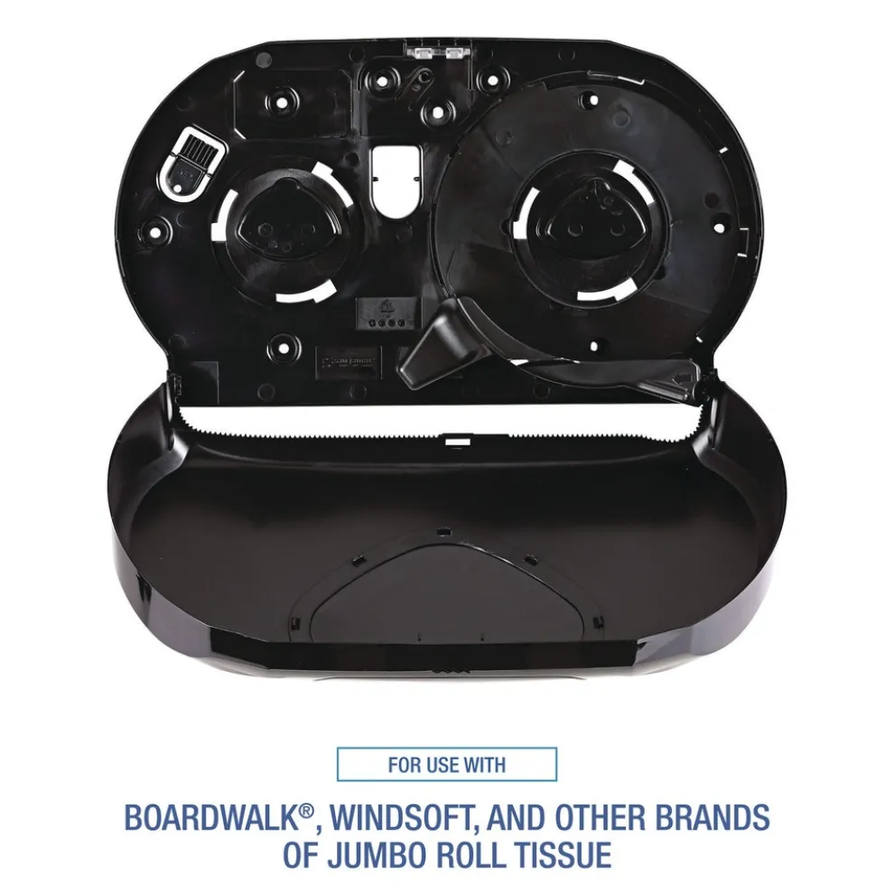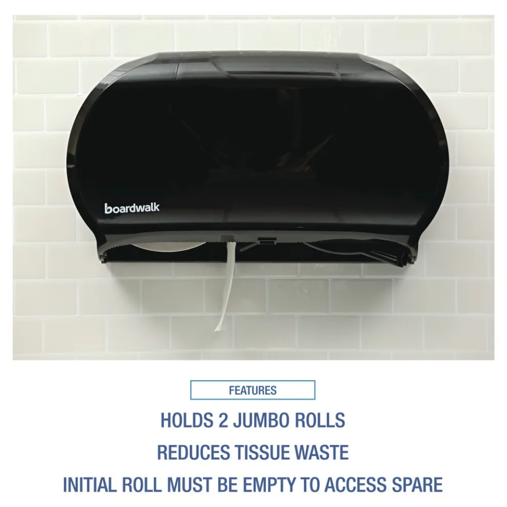 Sturdy Boardwalk toilet tissue dispenser houses two universal jumbo rolls. The twin roll design allows auto transfer from one roll to the next. Having double coverage from multiple rolls eliminates runouts, providing access to replacement roll after initial roll depletes. Prevents waste by ensuring one roll is used up before transferring to the second. Multi-roll design saves labor since two rolls can be stocked at a time. Compatible with Boardwalk, Windsoft, and other brands of jumbo roll toilet paper.