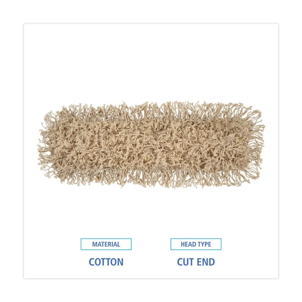 Ten-ply, Hygrade white cotton, cut-end design enhances durability while minimizing snags. Quick-drying, absorbent, slot pocket style with synthetic backing. Used for attaching a mop handle and dusting floors. Works with spray or liquid dust mop treatment and other solutions used to dust floors and add shine. Great for general purpose cleaning and wiping floor surfaces of various materials. Mop handle and dust mop frame are sold separately.