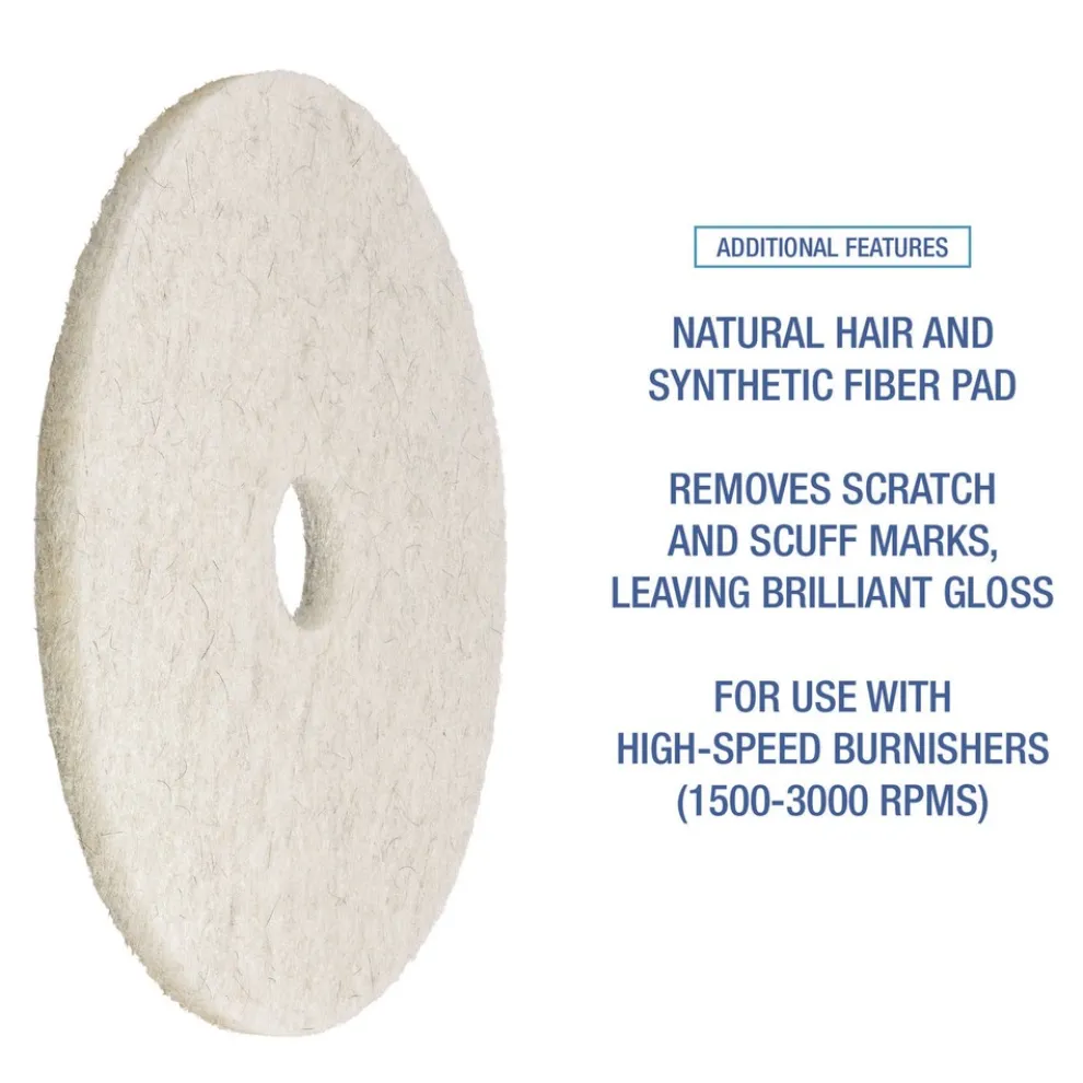 Take your floors to the next level with a natural and synthetic fiber, burnishing floor pad that removes unsightly scratches and scuff marks from floors. Add a brilliant, glossy shine to floors that welcomes customers and gives the right impression from the start. Value pad constructed from durable fibers that require less replacement. For use with ultra, high-speed burnishers (1,500 to 3,000 RPM).