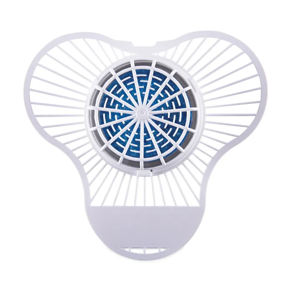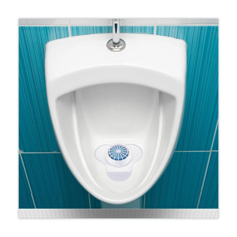 Boardwalk Urinal Screen with Non-Para Deodorizer Block deodorizes, cleans, and prevents scale build-up within the urinal. Every flush of the urinal tints the water blue so the water is noticeably treated. The pleasant, scented block eliminates odors and helps to maintain drain lines by fighting bacteria growth. The flexible plastic screen traps debris to further protect the drain. Long-lasting, lasts up to 1500 flushes.