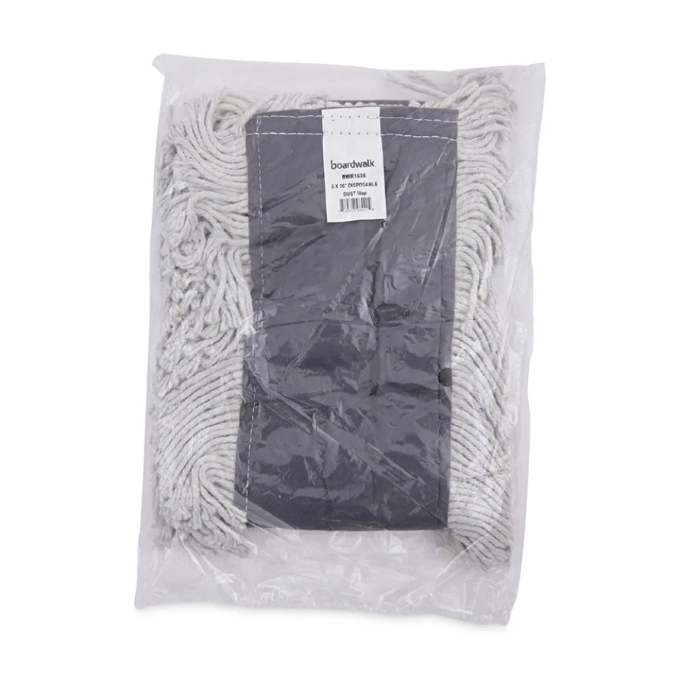 4-ply, pretreated yarn, dust mop head. Equipped with a slot pocket backing which allows a metal dust mop frame to slide into its place quickly and easily. Sewn center fringe for added coverage and durability. The disposable head can be discarded when dirty. Ideal for use on floors that require dusting, with or without cleaning spray. Handle and frame are sold separately.