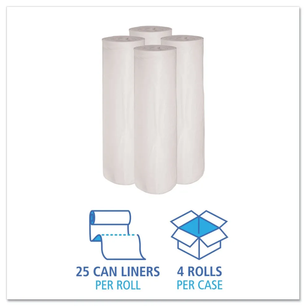 Low-density liners provide superior performance at an affordable price. Made from high-quality raw materials, mineral reinforced to enhance strength and puncture-resistance. Use with heavy loads, including sharp or abrasive materials. The sturdy, star-seal bottom helps prevent leaks and provides even weight distribution for easy removal from receptacle. Coreless perforated rolls are easy to use and great for dispensing on the go. A quality can liner that provides trusted waste collection for heavy-duty applications.