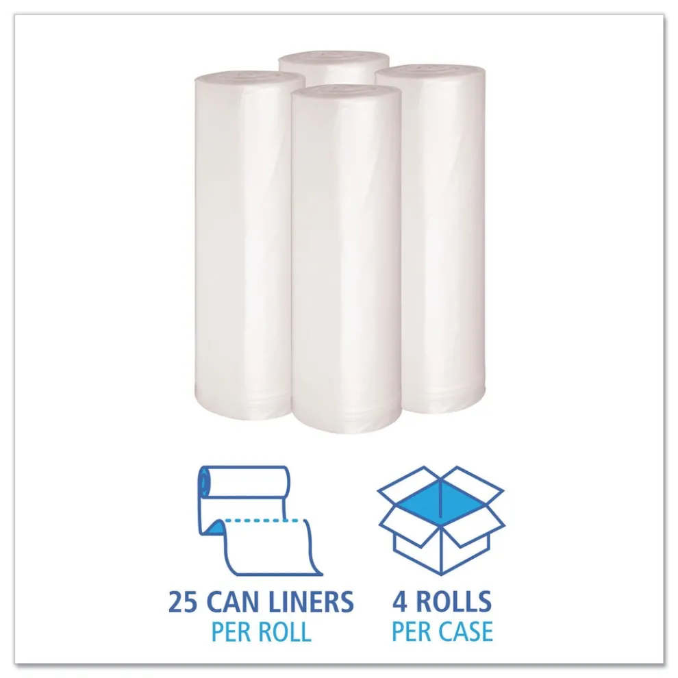 Can liner with equivalent strength of 2.0 mil liner. Perforated roll for easy dispensing. Coreless rolls save space and material.