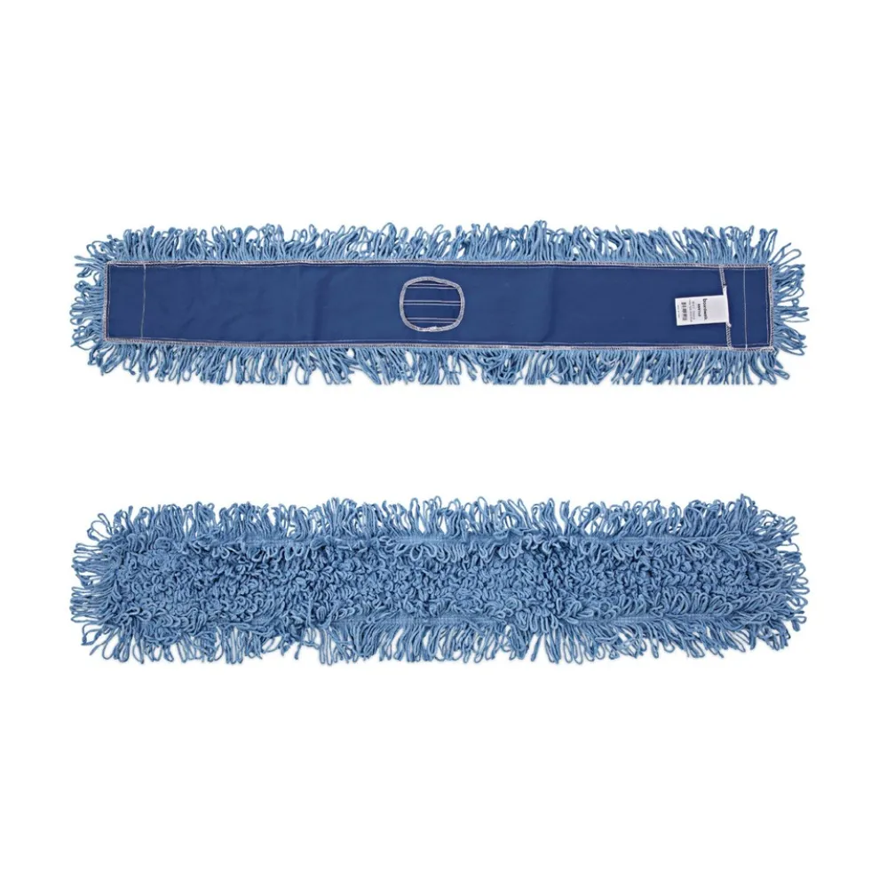 This dust mop head is sturdy and made from a 4-ply cotton/synthetic blend. It has looped ends as well as reinforced backing ends and stress points for extra durability. Washable and reusable for added value and less waste. It is easy to use with a slot top/clip-on closure. Ideal for use on delicate, hard surfaces such as hardwood, laminate, tile, and marble. Frame and handle are sold separately.