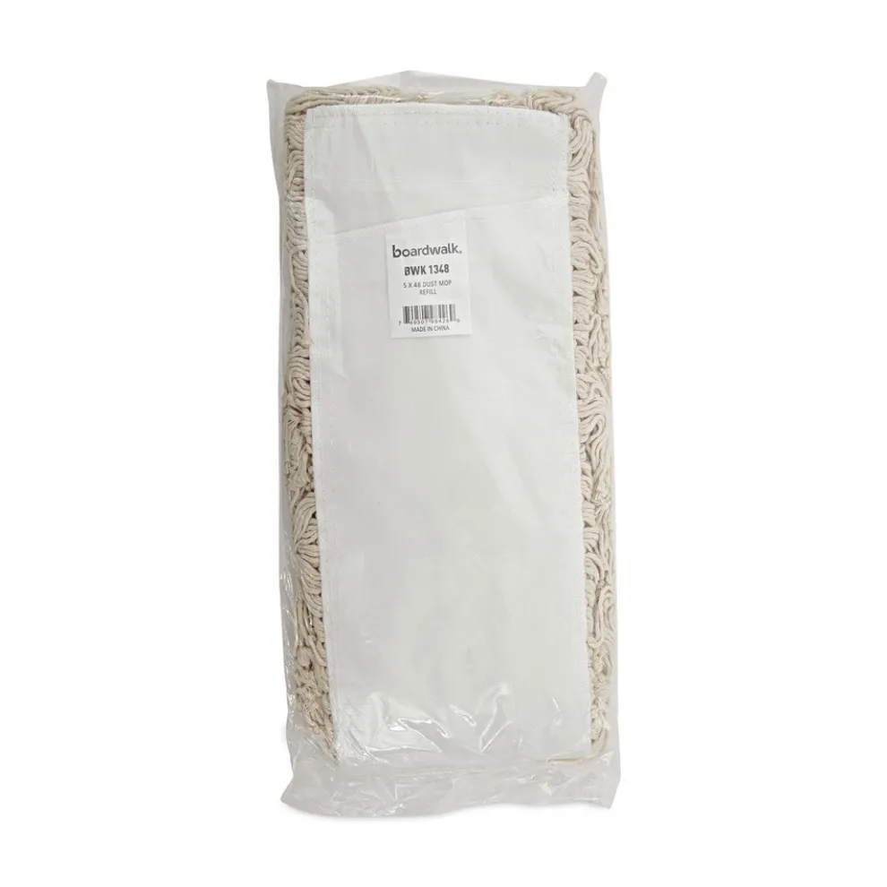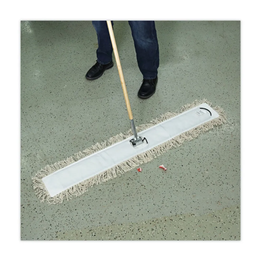 10-ply, Hygrade white cotton, cut-end design enhances durability while minimizing snags. Quick-drying, absorbent, slot pocket style with synthetic backing. Used for attaching a mop handle and dusting floors. Works with spray or liquid dust mop treatment and other solutions used to dust floors and add shine. Great for general purpose cleaning and wiping floor surfaces of various materials. Mop handle and dust mop frame are sold separately.