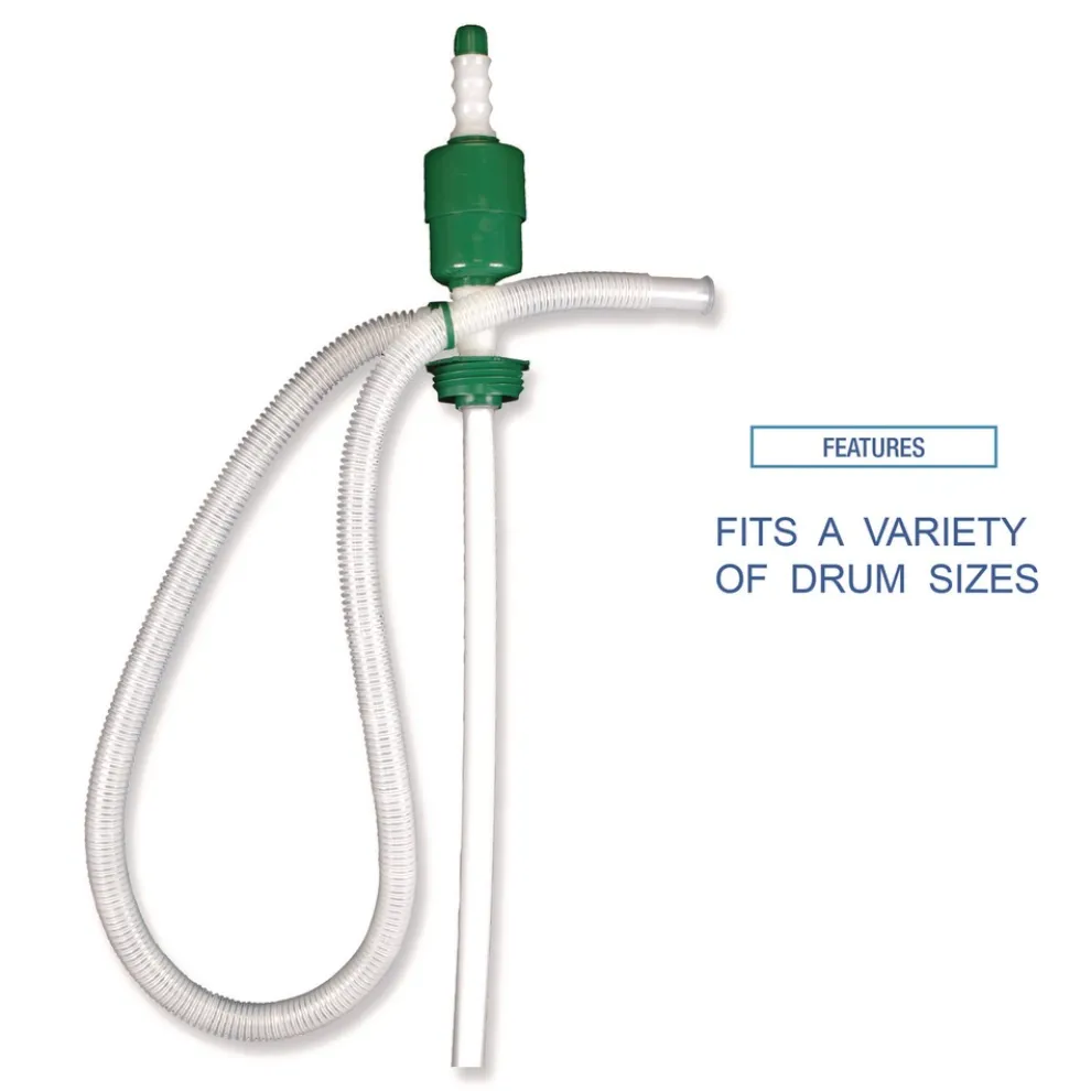 Versatile plastic drum pump fits a variety of sizes; works with 15, 30, and 55-gallon drums. Easy fingertip control. The easy-to-use screw top vent controls siphon flow. Compatible with most cleaning solutions and corrosive chemicals. Use with thin, easily flowing chemicals. Do not use with solvents. Available with 2 in. IPS adaptor for steel and plastic drums, or a 2 in. Buttress adaptor for plastic drums with buttress threads.