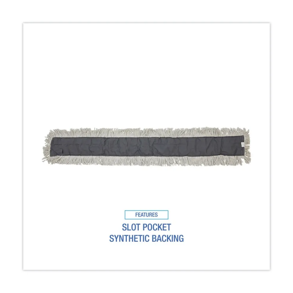 Four-ply, pretreated yarn, dust mop head. Equipped with a slot pocket backing which allows a metal dust mop frame to slide into its place quickly and easily. Sewn center fringe for added coverage and durability. The disposable head can be discarded when dirty. Ideal for use on floors that require dusting, with or without cleaning spray. Handle and frame are sold separately.
