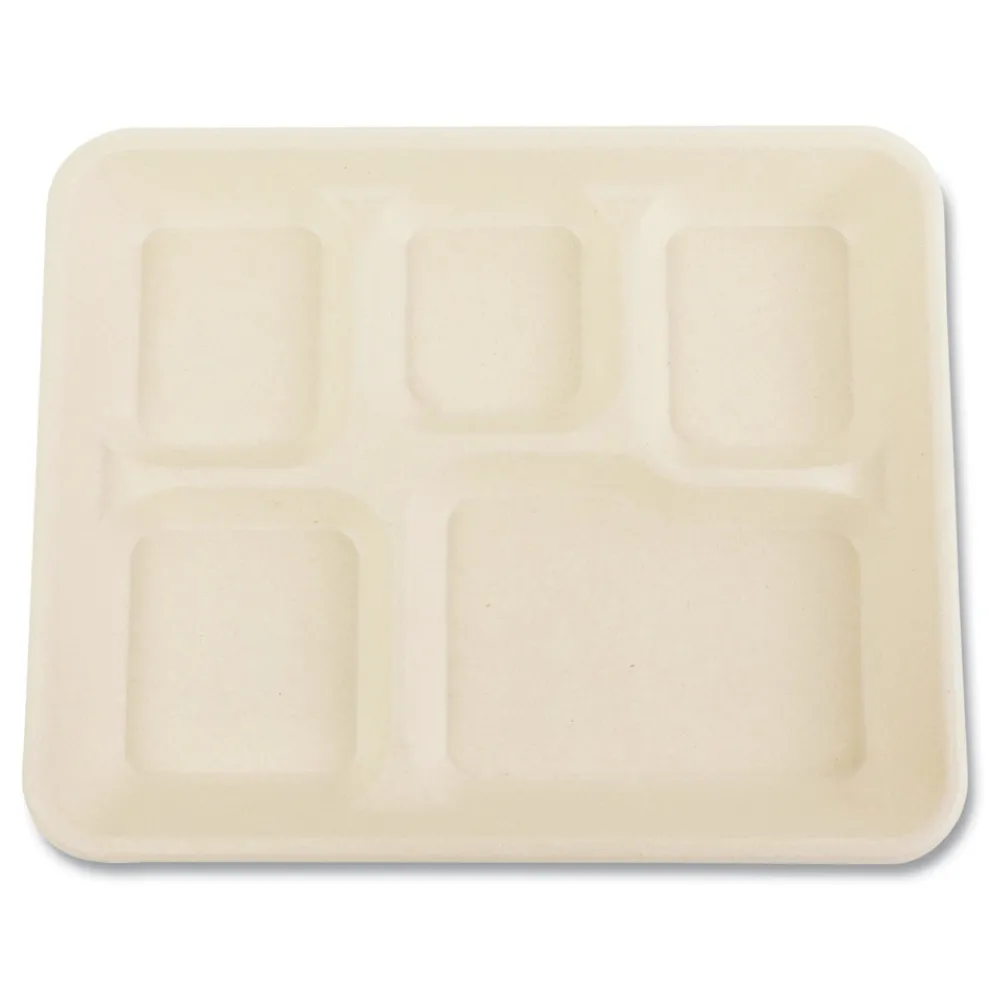 (500/Carton) 8.26 in. x 0.98 in. x 10.9 in. 5-Compartment Bamboo/Sugarcane Bagasse PFAS-Free Food Tray – Tan – TRAY128NPFA