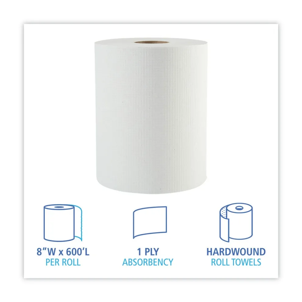 Boardwalk White Paper Towel Rolls are one-ply paper towels that are hardwound in rolls without perforations. Durable and absorbent material for hand drying in commercial washrooms with heavy traffic. Bleached white and slightly textured. Easy to grab and compatible with dispensers, which are sold separately. Great for frequent hand washing in offices, industrial settings, schools, healthcare, restaurants, public restrooms, and kitchens.