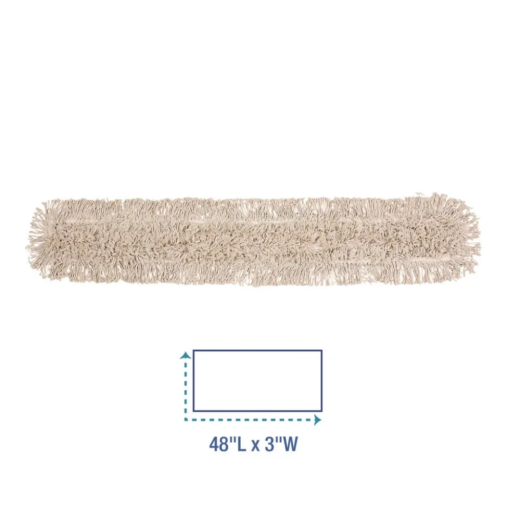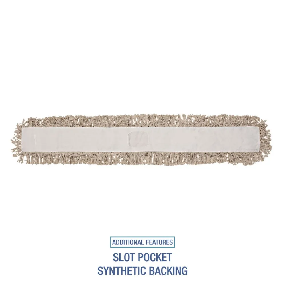 Ten-ply, Hygrade white cotton, cut-end design enhances durability while minimizing snags. Quick-drying, absorbent, slot pocket style with synthetic backing. Used for attaching a mop handle and dusting floors. Works with spray or liquid dust mop treatment and other solutions used to dust floors and add shine. Great for general purpose cleaning and wiping floor surfaces of various materials. Mop handle and dust mop frame are sold separately.