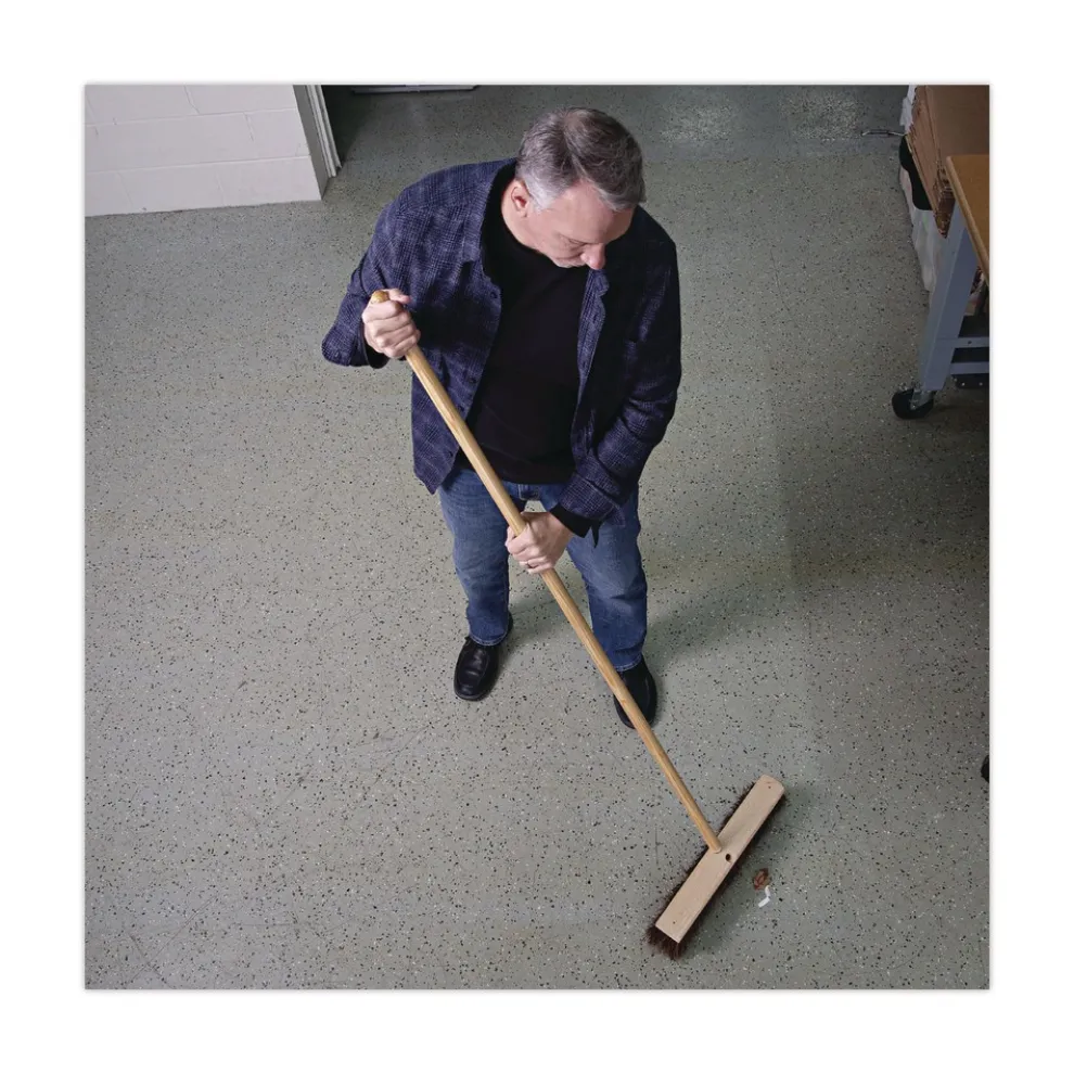 Precision-cut, threaded end broom handle. Natural colored, lacquered hardwood handle with smooth finish that resists splintering and is comfortable for extended use. Composed of solid hardwood for maximum durability and dependability for heavy-duty use applications. The rounded tip makes maneuvering and transport easy. Compatible with wood block brooms that accept a threaded handle, which are sold separately.