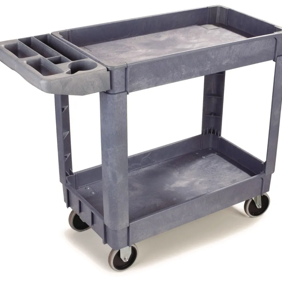 Durable resin construction, gray, two-shelf utility cart with casters. Molded-in plastic handle allows for easy steering on the go. The handle and raised top rim are great for hanging cleaning products and supplies to tackle cleaning jobs from one room to the next. Convenient swivel casters allow multi-directional travel around tight corners. Two fixed shelves provide sturdy storage for all your janitorial supplies.