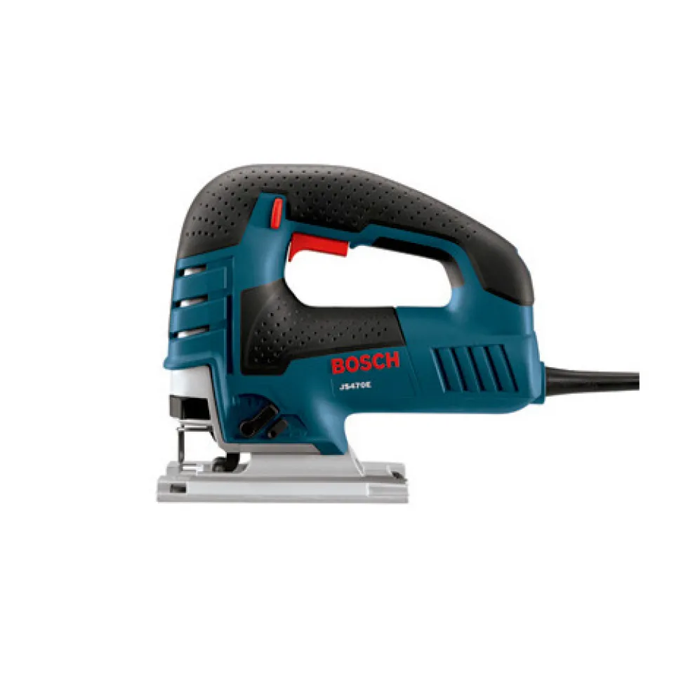 The Bosch JS470E Top-Handle Jig Saw features a powerful motor and sophisticated electronic circuitry. Installers, carpenters and cabinet makers will appreciate its 7.0-amp muscle. It has a variable-speed dial and an accelerator trigger, and it comes with internal precision control and a low-vibration design. The saw also has a large die-cast aluminum footplate with a steel insert and on-board bevel wrench, a dust blower for max cut-line visibility and a toolless blade-change system.