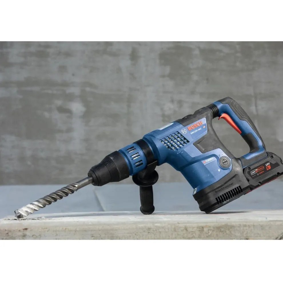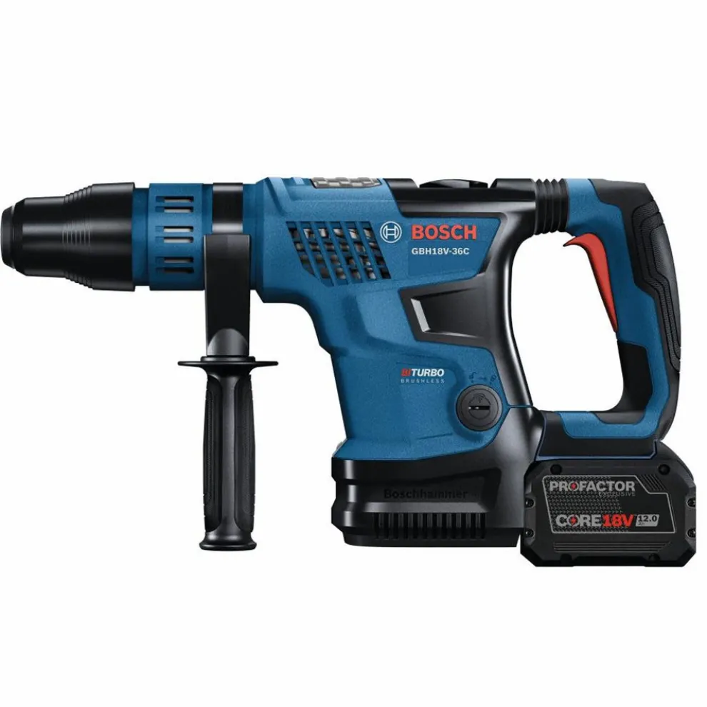 This 18V SDS-Max 1-9/16 in. Rotary Hammer is powerful enough to provide corded-type performance for tackling heavy-duty concrete drilling or chiseling jobs. The Bosch GBH18V-36C Rotary Hammer delivers 5.2 ft-lbs. of impact energy (EPTA), which is unprecedented for a single 18V battery-driven SDS-max 1-9/16 in. rotary hammer. It weighs 13.4 lbs. (with the included battery). This hammer is part of the PROFACTOR System, which pairs BITURBO Brushless Technology with a CORE18V High Power Battery. BITURBO Brushless Technology is a high-performance motor and drivetrain system designed to deliver power comparable to high-demand corded tools. The anti-vibration system features a longer air cushion in the hammer tube and dampeners in the handle. The hammer has KickBack Control, rotary hammer and hammer-only modes, a reverse setting, and Vario-Lock to rotate and lock the chisel. The hammer features an on-tool user interface for tool performance, feedback, and control. This hammer features connectivity (module sold separately), providing a link to the free Bosch Toolbox App on a connected device to customize settings. The kit includes 2 CORE18V 8 Ah High Power Batteries, each delivering 50 percent more runtime and over 75 percent more power than the CORE18V 4 Ah battery, powering high-demand applications. The kit has a GAL18V-160C Battery Rurbo Charger, which provides a 16 Amp charging current for fast and faster charging, with an optional Power Boost mode.