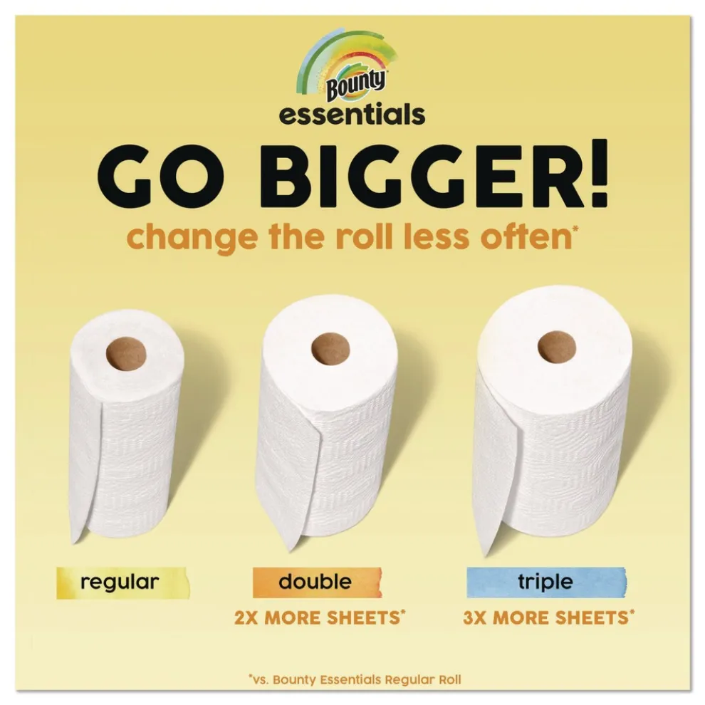 Cheap stuff not holding up? That’s why Bounty Essentials were made, where performance meets affordability. Bounty Essentials Select-A-Size paper towels are strong enough to handle multiple messes and soft enough to use on your family. With Select-A-Size sheets you can decide how much you use depending on your mess.