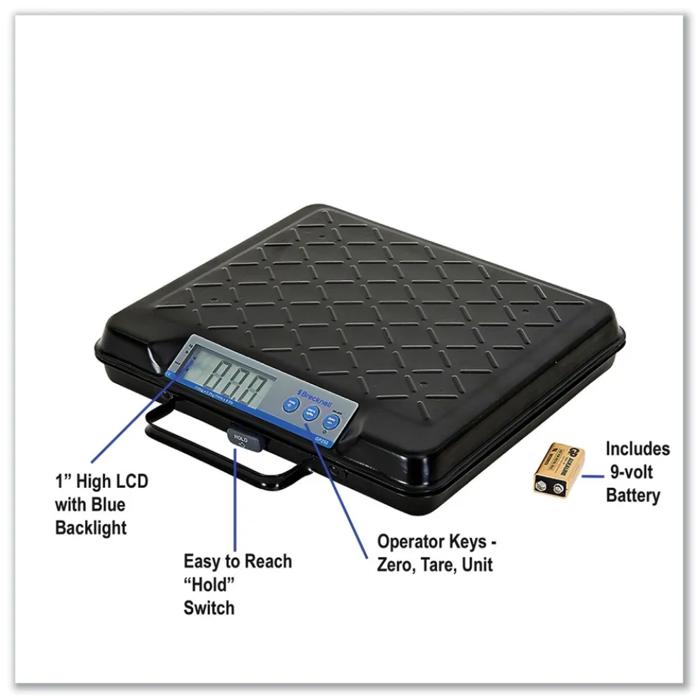 Portable bench scale which is designed for greater accuracy with attached handle. Weight hold key locks weight reading when a larger package blocks the display. Internal backlit display with four 1 in. high LCD digits for easy visibility. Discreet keyboard technology. Electro-mechanic design. 22-gauge steel base. Auto-zero tracking and manual zero return. 250 lbs. capacity. Programmable auto-shut-down.