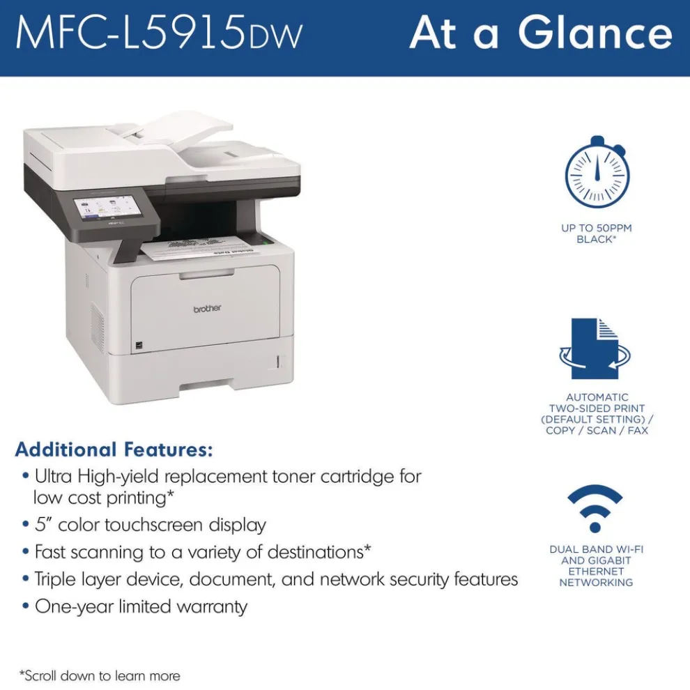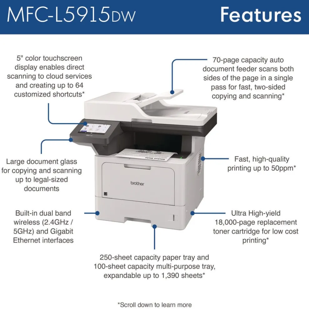 The Brother MFC-L5915DW business monochrome laser all-in-one printer is a great choice for busy offices and workgroups with higher print volumes that need fast, high-quality output, low-cost printing, versatile paper handling, and advanced security features. This high-performance all-in-one printer helps to increase productivity with fast print and copy speeds up to 50 ppm. Delivers low-cost printing by using the Brother Genuine TN920UXXL ultra high-yield replacement toner cartridge. Triple Layer Security features help to limit document and device access and protect against network intrusions. Offers expandable paper capacity that is scalable as your business needs grow. Quickly scan multi-page documents to a wide variety of destinations using the 70-page capacity auto document feeder. The 5 in. touchscreen display allows for the creation of customized shortcuts to your most frequently used workflows. The MFC-L5915DW also provides flexible connectivity with built-in Gigabit Ethernet and dual band wireless networking, plus convenient mobile device printing to meet mobile workforce demands.